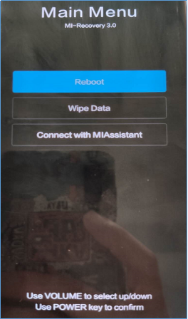 A1: Vui lòng các bước sau: 1. Tắt nguồn điện thoại di động. 2. Nhấn và giữ phím “VOLUME +” và phím NGUỒN để vào chế độ Khôi phục. 3. Xóa dữ liệu. Lưu ý: bước này sẽ khiến tất cả dữ liệu trên điện thoại bị xóa và dữ liệu sẽ không được truy xuất nếu không được sao lưu trước. 4. Khởi động lại điện thoại để thoát khỏi chế độ Khôi phục. (Xem hình 1) Hình1 Nếu người dùng đã đăng nhập tài khoản Mi trên điện thoại và chưa đăng xuất ra thì sẽ được hệ thống yêu cầu nhập password để truy cập vào thiết bị điện thoại sau khi khởi động lại. Anh chị vui lòng thực hiện các bước sau: