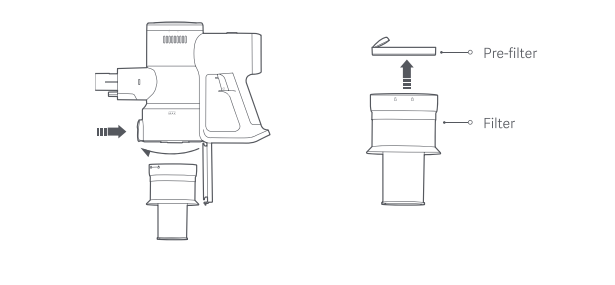 1. Nhấn nút xả bụi để mở ngăn chứa bụi và xoay bộ lọc theo hướng được chỉ ra trong sơ đồ để loại bỏ nó. Tháo bộ lọc trước khỏi bộ lọc;