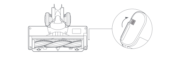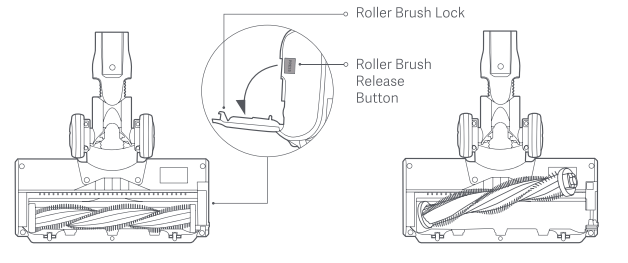 1. Đặt bàn chải lộn ngược, nhấn nút nhả bàn chải con lăn để mở khóa bàn chải con lăn và lấy bàn chải con lăn ra;