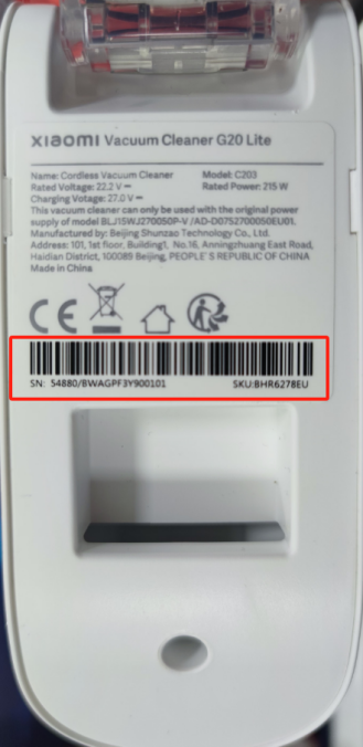 Q14: Tôi có thể tìm thông tin SN (Số sê-ri) trên Máy hút bụi Xiaomi G20 Lite ở đâu?