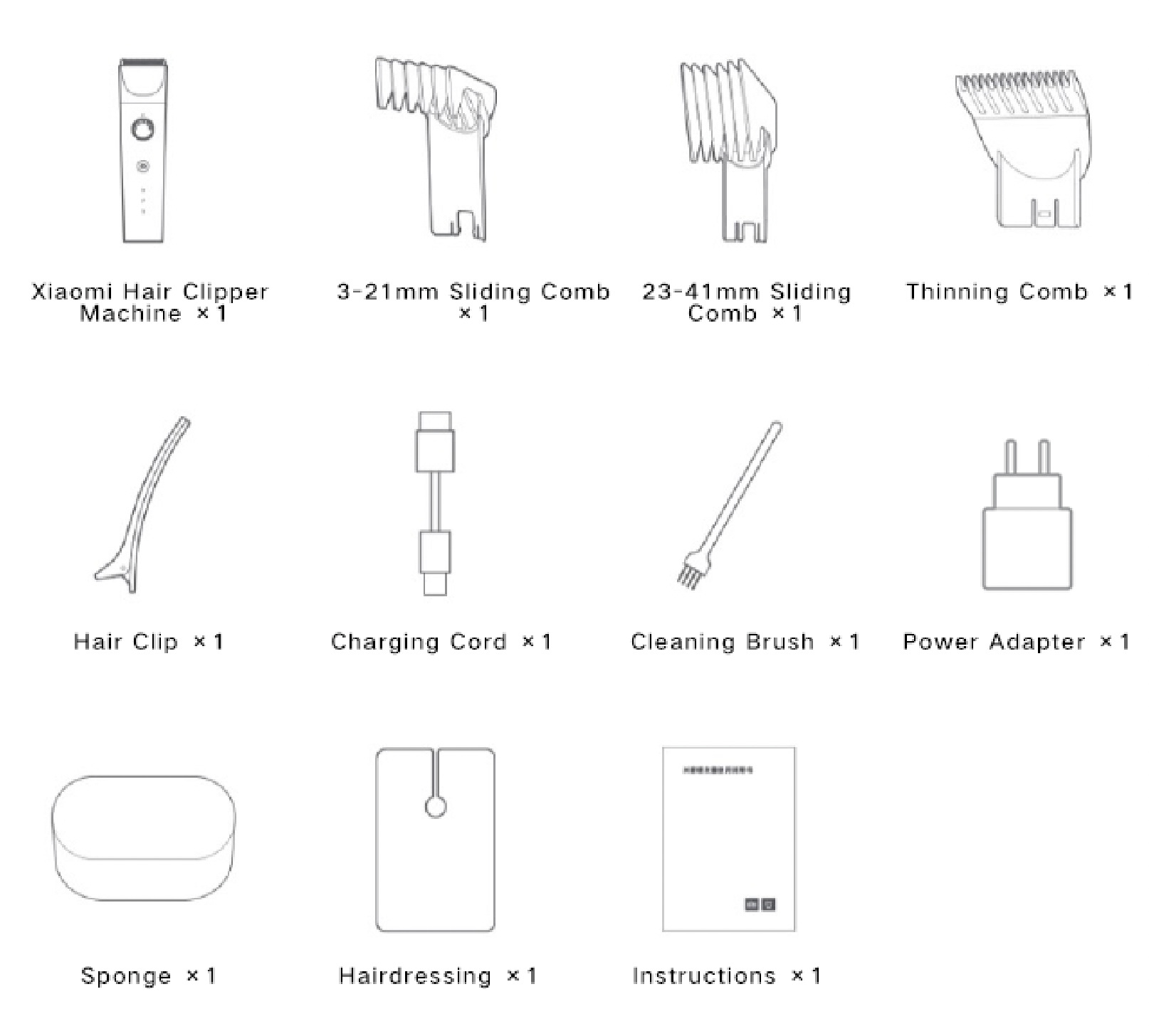 HK, phiên bản TW: Máy cắt tóc Xiaomi ×1, lược trượt 3-21mm ×1, lược trượt 23-41mm ×1, lược mỏng ×1, kẹp tóc ×1, dây sạc ×1, bàn chải làm sạch ×1, bọt biển ×1, làm tóc ×1.