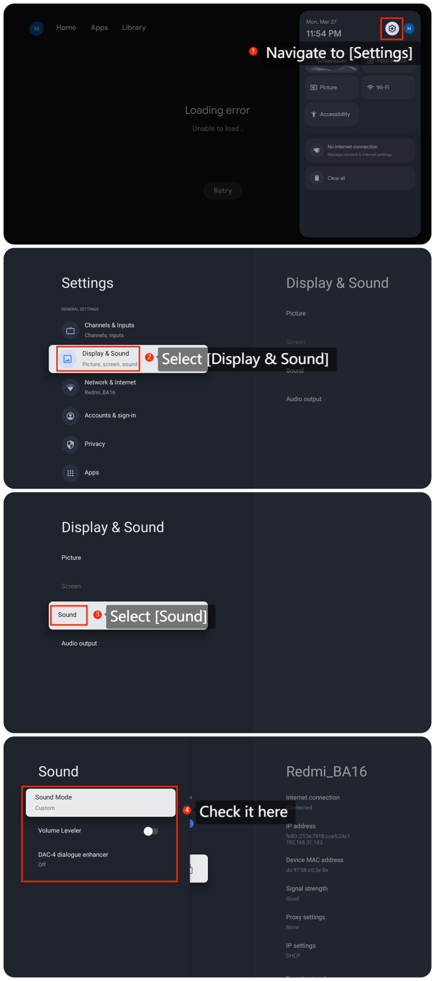 3. Kiểm tra cài đặt âm thanh của Tivi bằng cách điều hướng đến [Settings] >> [Display &; Sound] >> [Sound] >> kiểm tra các cài đặt liên quan;