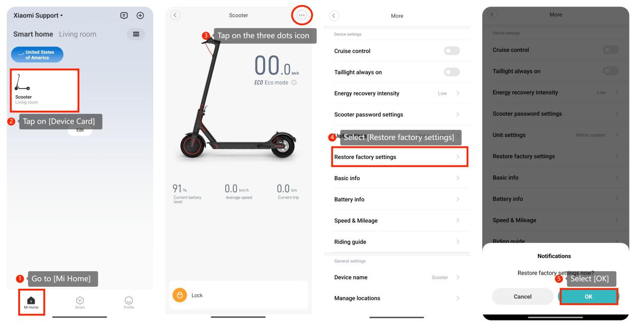 10. Vui lòng thực hiện khôi phục cài đặt gốc trên xe tay ga của bạn. Hãy nhớ rằng thao tác này sẽ xóa tất cả các cài đặt được cá nhân hóa, vì vậy hãy sử dụng tùy chọn này làm phương sách cuối cùng. Chuyển đến ứng dụng Mi Home >> [Mi Home] >> nhấn vào [Thẻ thiết bị] >> nhấn vào biểu tượng ba chấm ở góc trên bên phải >> [Khôi phục cài đặt gốc] >> [OK].