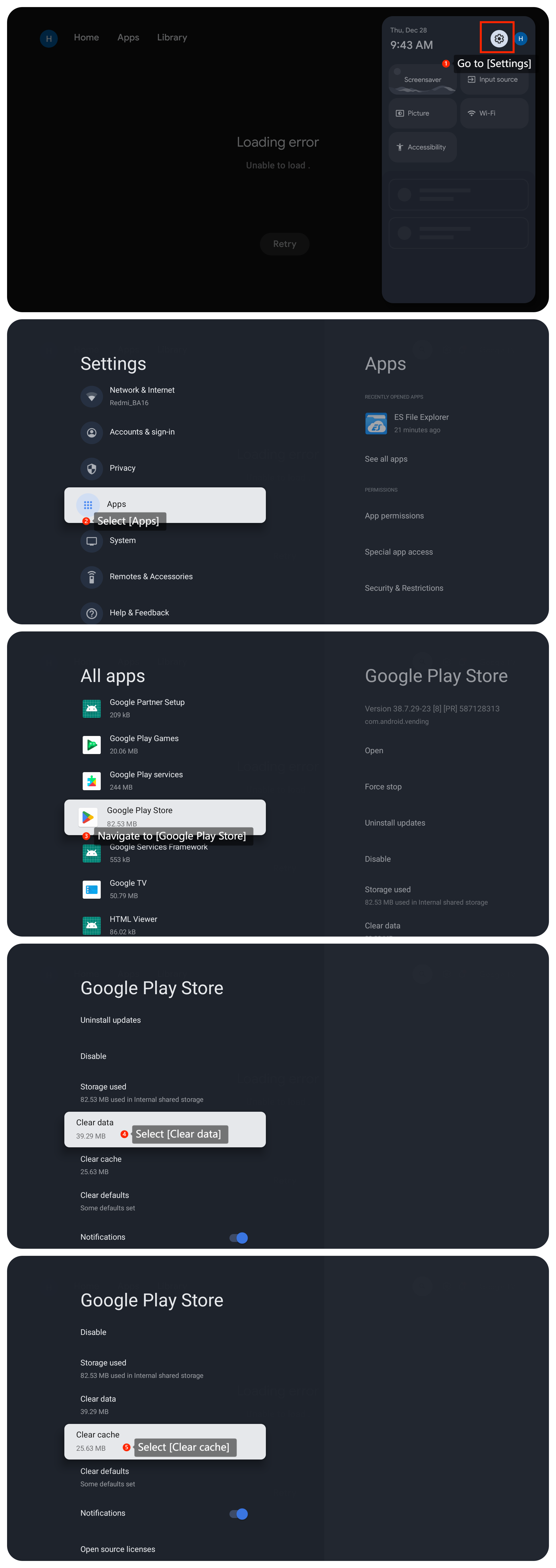 5. Bạn có thể xóa dữ liệu hoặc bộ nhớ cache cho Cửa hàng Google Play bằng cách đi tới [Cài đặt]>> [Ứng dụng] >> [Cửa hàng Google Play] >> chọn[Xóa dữ liệu] hoặc [Xóa bộ nhớ cache].Sau đó thử cài đặt lại ứng dụng;