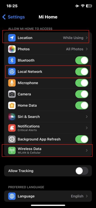 Đối với APP Mi Home / Xiaomi Home của hệ thống iOS, vui lòng bật quyền của mạng Wi-Fi và mạng dữ liệu. Nếu giao diện sau bật lên trong quá trình ràng buộc, vui lòng bật các tùy chọn [Vị trí] và [Mạng cục bộ] cho APP Mi Home / Xiaomi Home và đặt tùy chọn [Dữ liệu không dây] để cho phép sử dụng mạng WLAN và dữ liệu di động.