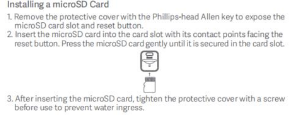 9. Q: Xiaomi Outdoor Camera AW300 Làm thế nào để cài đặt thẻ Micro SD? Đáp:1. Tháo nắp bảo vệ bằng tuốc nơ vít để lộ khe cắm thẻ Micro SD và nút đặt lại;2. Lắp thẻ Micro SD vào lô thẻ, vui lòng chú ý hướng lắp Micro SD để xem hình bên dưới;3. Sau khi lắp Micro SD, vui lòng đảm bảo siết chặt nắp bảo vệ bằng ốc vít trước khi sử dụng để tránh nước xâm nhập;
