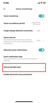 2. Bật cài đặt đèn cảnh báo trong báo động âm thanh và ánh sáng, bật cảnh báo đèn khi phát hiện ai đó đang di chuyển, đồng thời điều chỉnh độ sáng ánh sáng và chế độ ánh sáng.