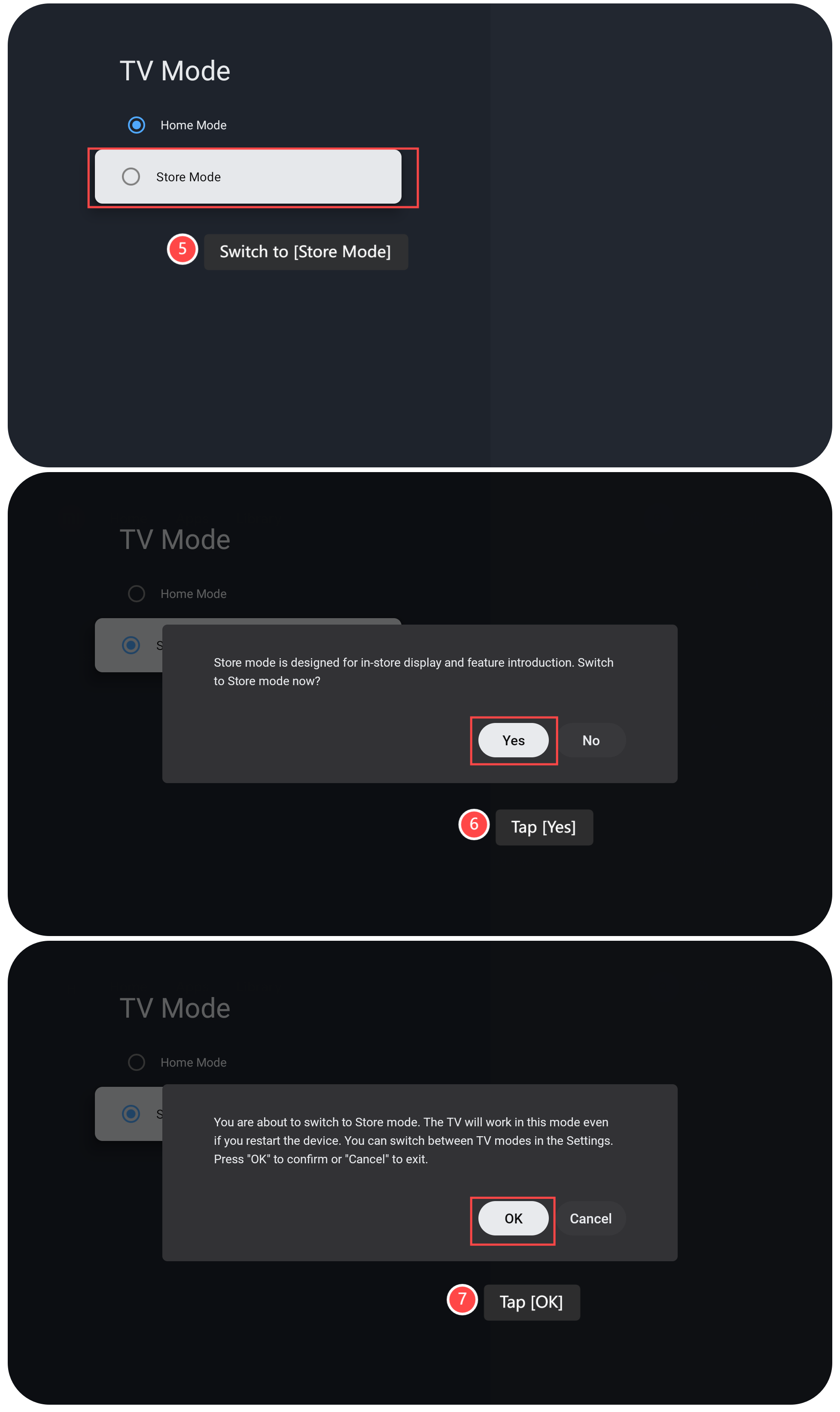 Sau khi bạn chuyển sang Chế độ Store, TV của bạn sẽ vẫn hoạt động ở chế độ này ngay cả khi bạn khởi động lại thiết bị.