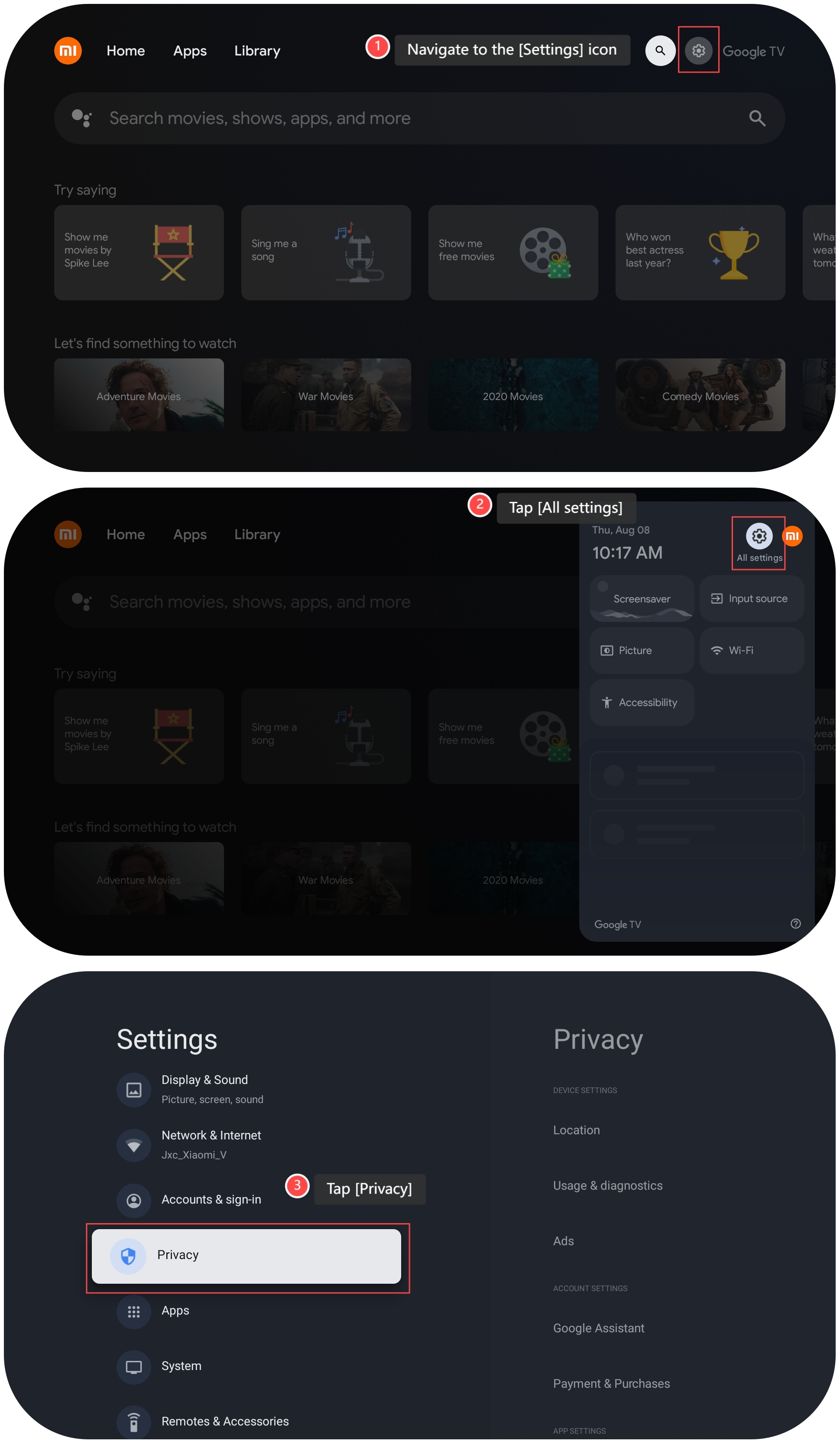 Cách 2: 1. Điều hướng đến biểu tượng [Cài đặt]; 2. Nhấn vào [Tất cả cài đặt]; 3. Nhấn vào [Quyền riêng tư];