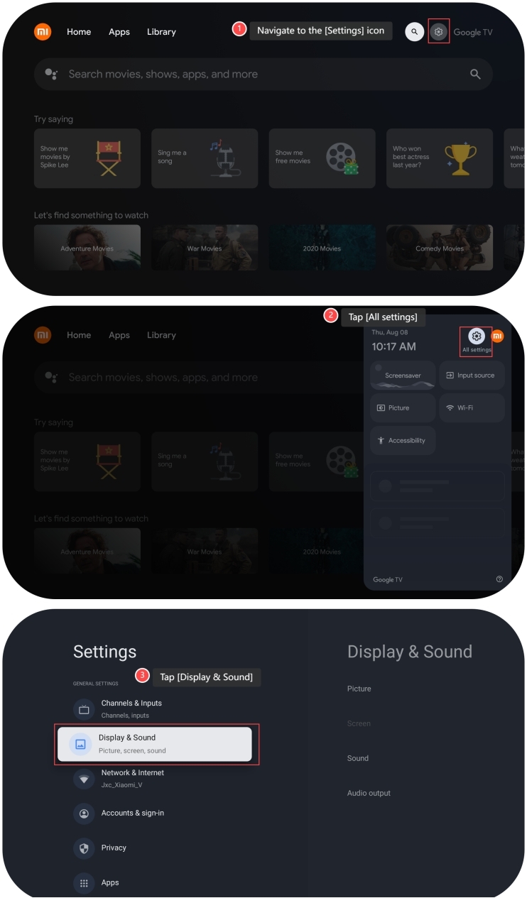 Ghi: Nếu bạn muốn hiệu chỉnh âm lượng, vui lòng tham khảo các bước sau: 1. Điều hướng đến biểu tượng [Cài đặt]; 2. Nhấn vào [Tất cả cài đặt]; 3. Nhấn vào [Hiển thị &; Âm thanh];