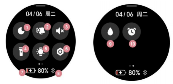 Nhận xét 1. Nếu không thể bật đồng hồ sau khi đặt trong thời gian dài, biểu tượng sạc sẽ hiển thị sau khi sạc trước khoảng 1 phút khi sử dụng lại;Nhận xét 2. Vui lòng lau sạch các điểm tiếp xúc sạc của đồng hồ trước khi sạc để tránh mồ hôi hoặc hơi ẩm.4.Q: Các chức năng của Bảng điều khiển Xiaomi Watch S1 Active là gì?A: Xiaomi Watch Color 2 có thể vào bảng điều khiển bằng cách vuốt lên ở cạnh dưới của trang chủ quay số. Ý nghĩa của các biểu tượng từ trên xuống dưới và từ trái sang phải như sau: