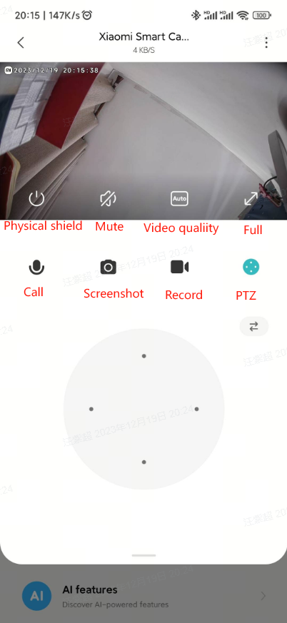 Nhấn vào Ghi màn hình để ghi lại màn hình giám sát hiện tại và lưu video vào album cục bộ và Ứng dụng Mi Home.8. Điều khiển PTZ: