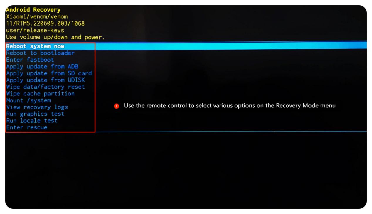 4. Bạncó thể sử dụng các nút định hướng trên điều khiển từ xa để chọn các tùy chọn khác nhau trên menu Chế độ khôi phục;