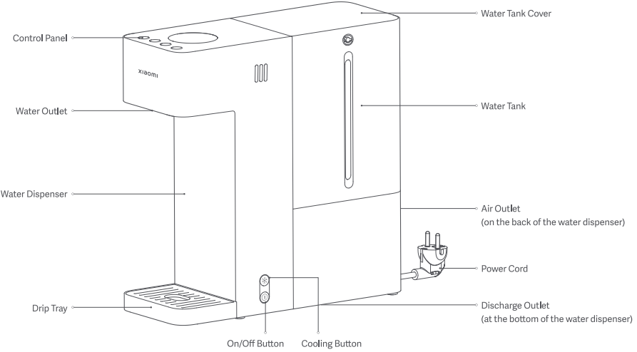 Tổng quan về các nút và chỉ báo của Bộ phân phối nước thông minh Xiaomi (Nóng và Lạnh) được liệt kê dưới đây: