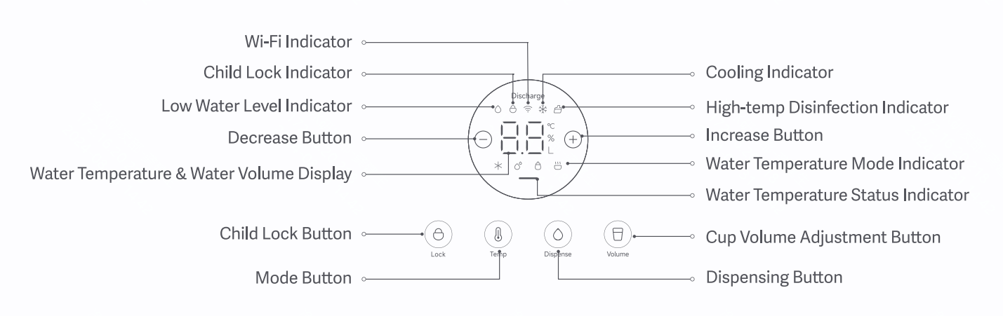 Có nút giảm, nút tăng, nút khóa trẻ em, nút chế độ, nút điều chỉnh âm lượng cốc, nút pha chế, chỉ báo Wi-Fi, chỉ báo khóa trẻ em, chỉ báo mực nước thấp, chỉ báo làm mát, chỉ báo khử trùng nhiệt độ cao, chỉ báo chế độ nhiệt độ nước, chỉ báo trạng thái nhiệt độ nước và hiển thị nhiệt độ nước &; lượng nước.