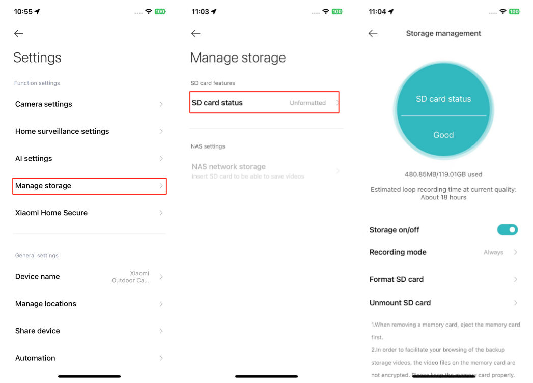 3. Nếu thẻ lưu trữ không ghi hoặc không thể tự động xóa tệp theo chu kỳ, bạn có thể định dạng thẻ trong Mi Home / Xiaomi Home APP >> [Cài đặt] >> [Quản lý bộ nhớ];