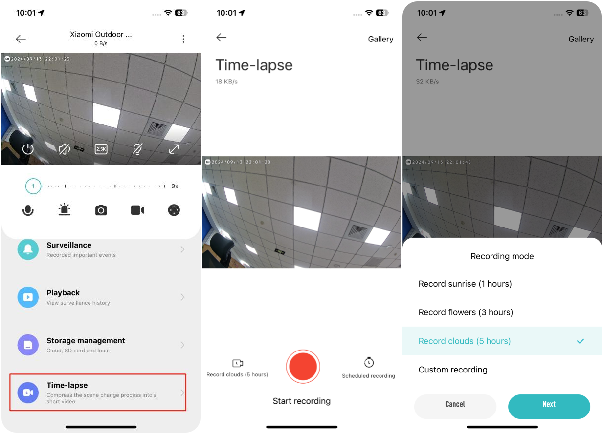 A: 1. Mở Mi Home / Xiaomi Home APP > > chọn máy ảnh > > [Time-lapse];