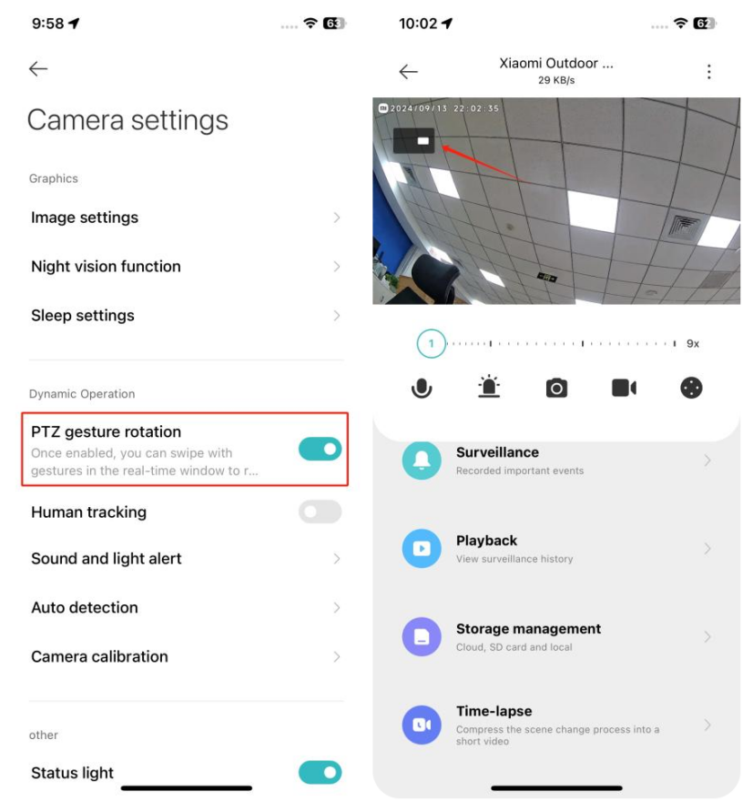 A: Mở Mi Home / Xiaomi Home APP > > chọn máy ảnh >> [Máy ảnh settings] >> [PTZ gesture rotation].