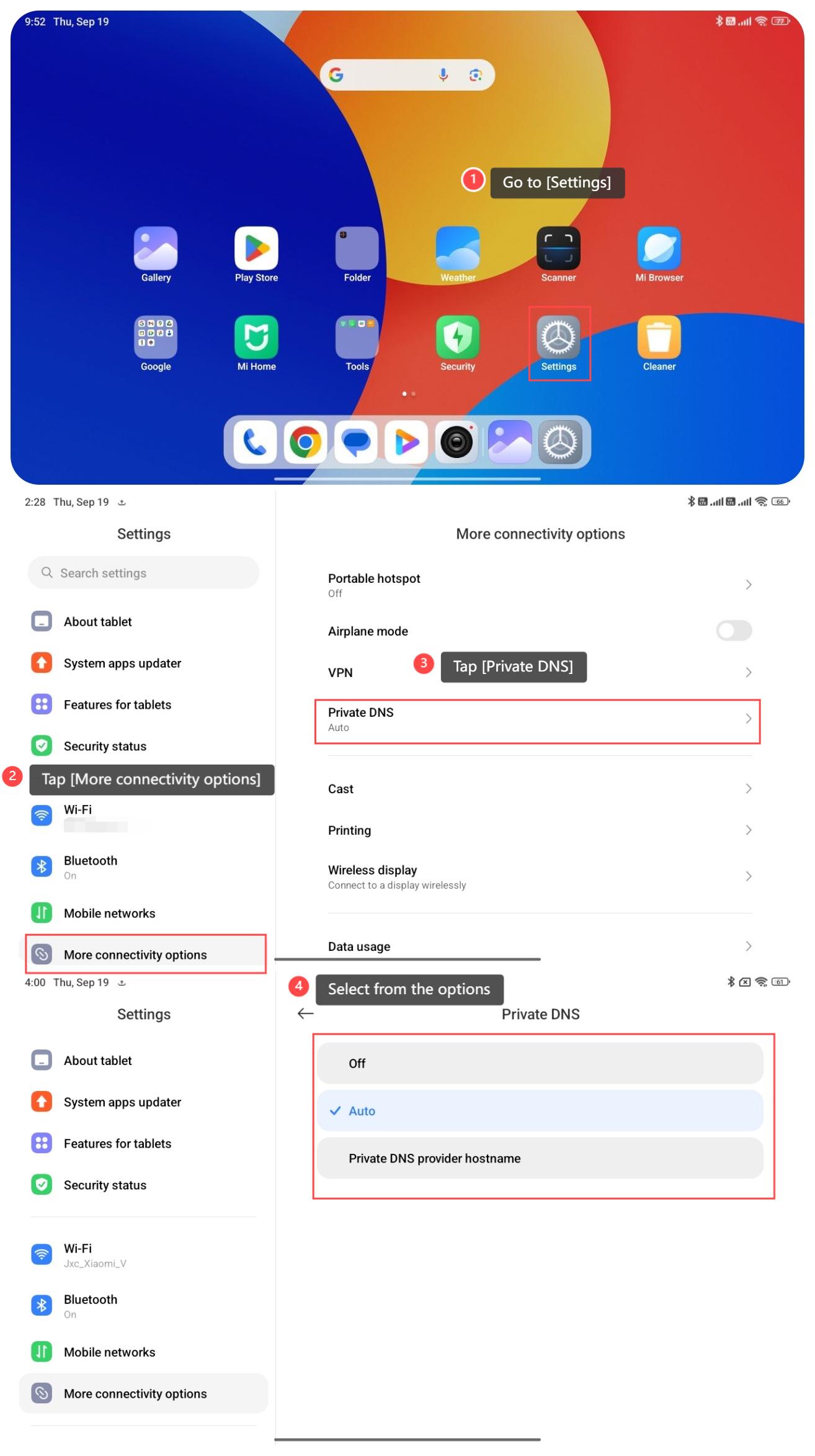 Để đặt DNS riêng trên máy tính bảng của bạn, vui lòng tham khảo các bước sau: