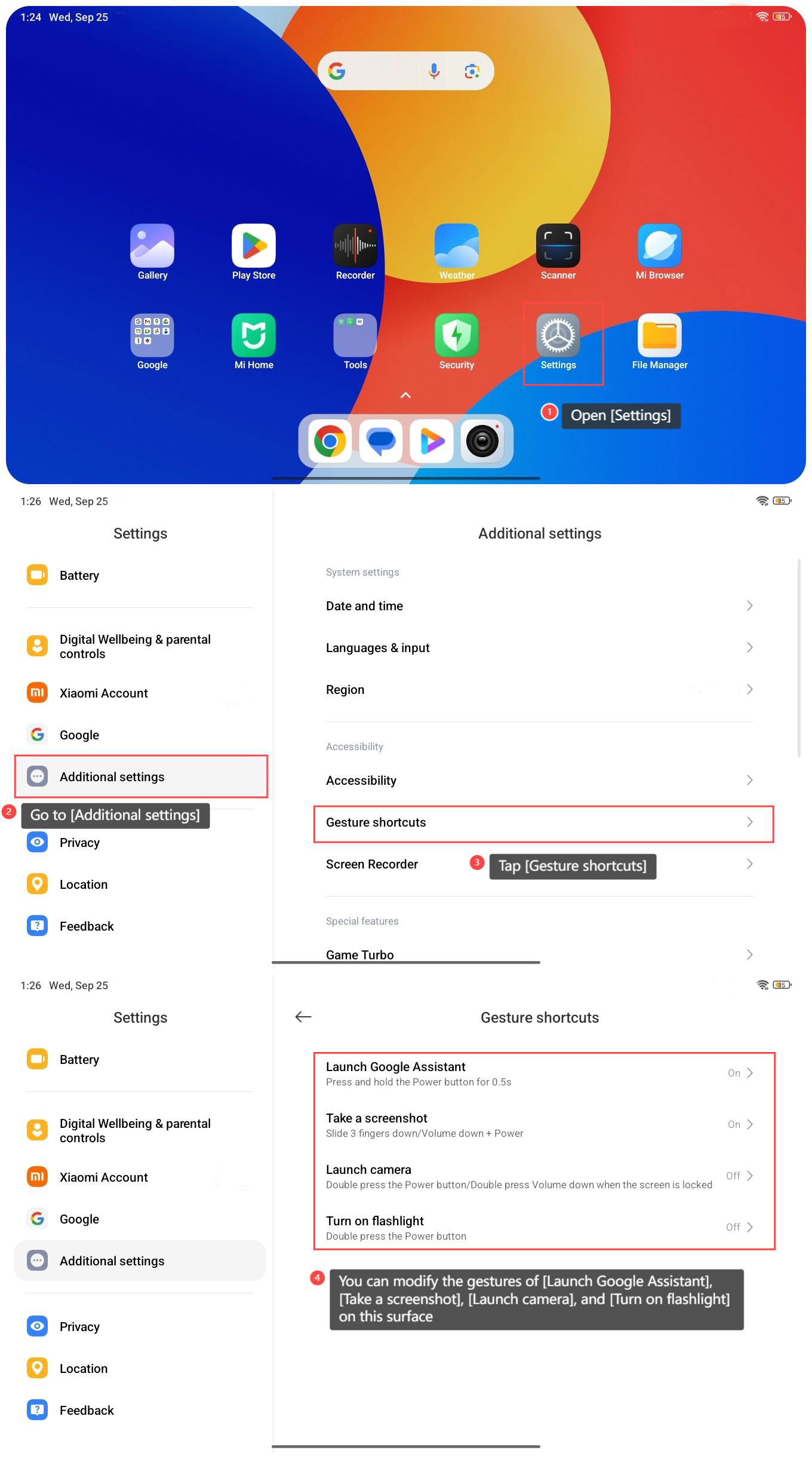 4. Bạn có thể sửa đổi các cử chỉ của [Khởi chạy Trợ lý Google], [Chụp ảnh màn hình], [Khởi chạy máy ảnh] và [Bật đèn pin] trên bề mặt này;
