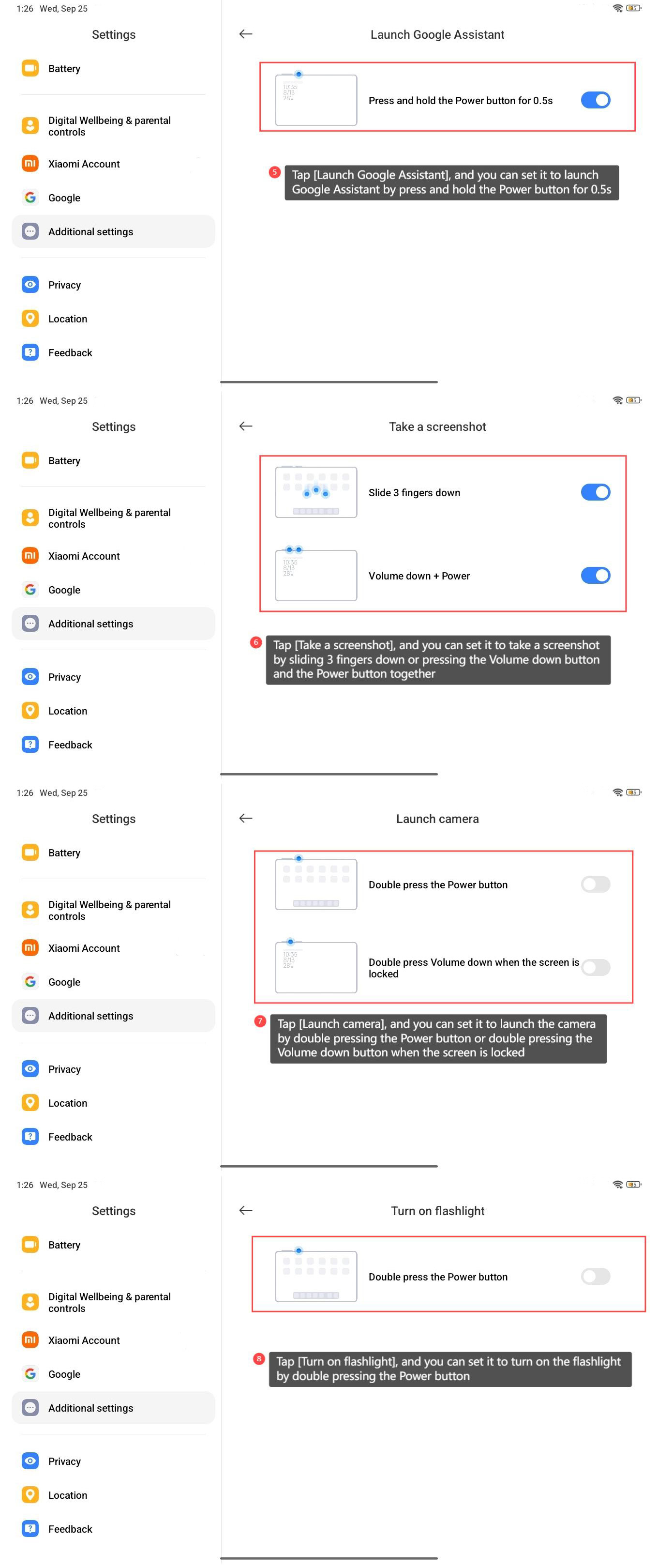 8. Nhấn vào [Bật đèn pin] và bạn có thể cài đặt nó để bật đèn pin bằng cách nhấn đúp nút Nguồn.