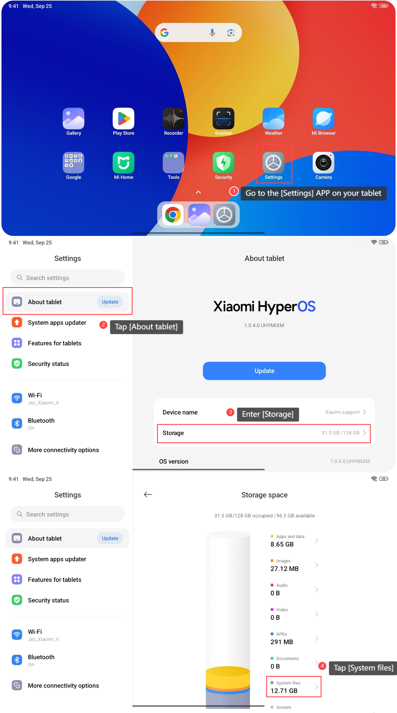 Phần mở rộng bộ nhớ cho phép tạo thêm RAM bằng cách sử dụng không gian lưu trữ có sẵn. Chỉ sử dụng tính năng này khi có đủ dung lượng lưu trữ trên Redmi Pad SE 8.7. Để thiết lập phần mở rộng bộ nhớ trên máy tính bảng, vui lòng tham khảo các phương pháp sau: Cách 1: 1. Đi tới ỨNG DỤNG [Cài đặt] trên máy tính bảng của bạn; 2. Nhấn vào [Giới thiệu về máy tính bảng]; 3. Nhập [Lưu trữ]; 4. Nhấn vào [Tệp hệ thống];