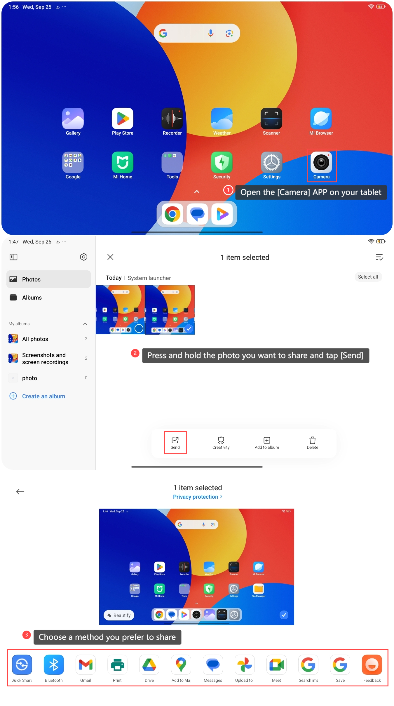 Gửi ảnh từ Thư viện trên Redmi Pad SE 8.7 đến một thiết bị khác cho phép chia sẻ nhanh những kỷ niệm, đơn giản hóa việc cộng tác và cho phép dễ dàng truy cập vào hình ảnh trên nhiều thiết bị, nâng cao giao tiếp và năng suất.
