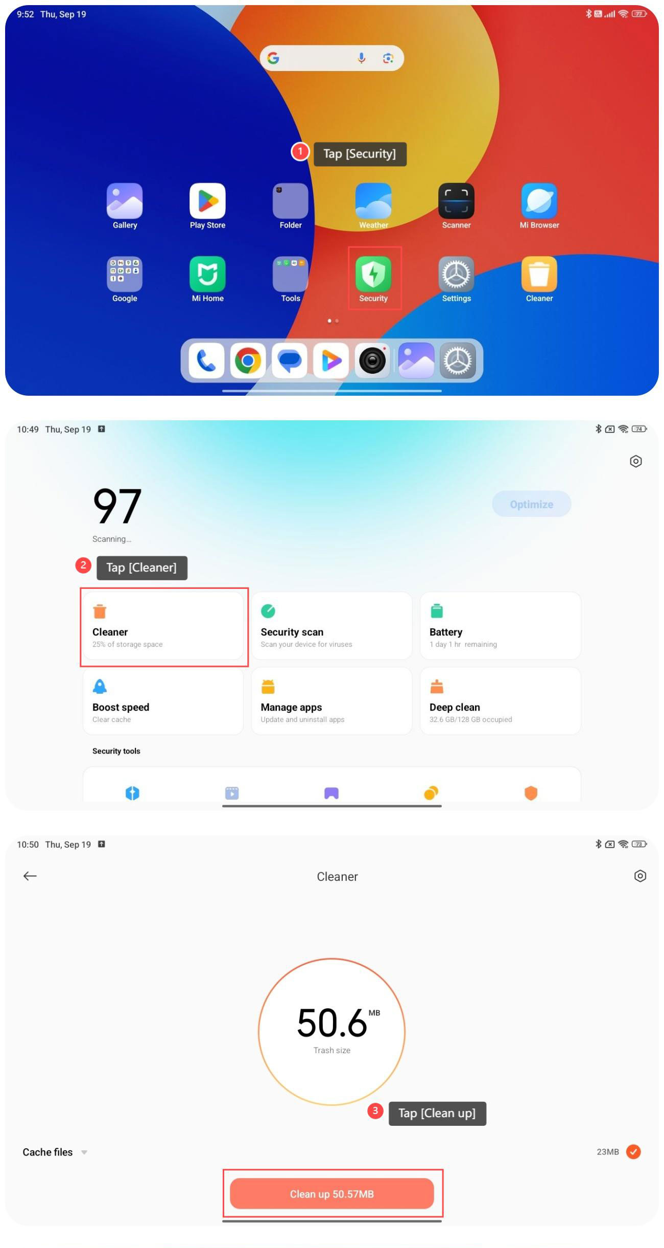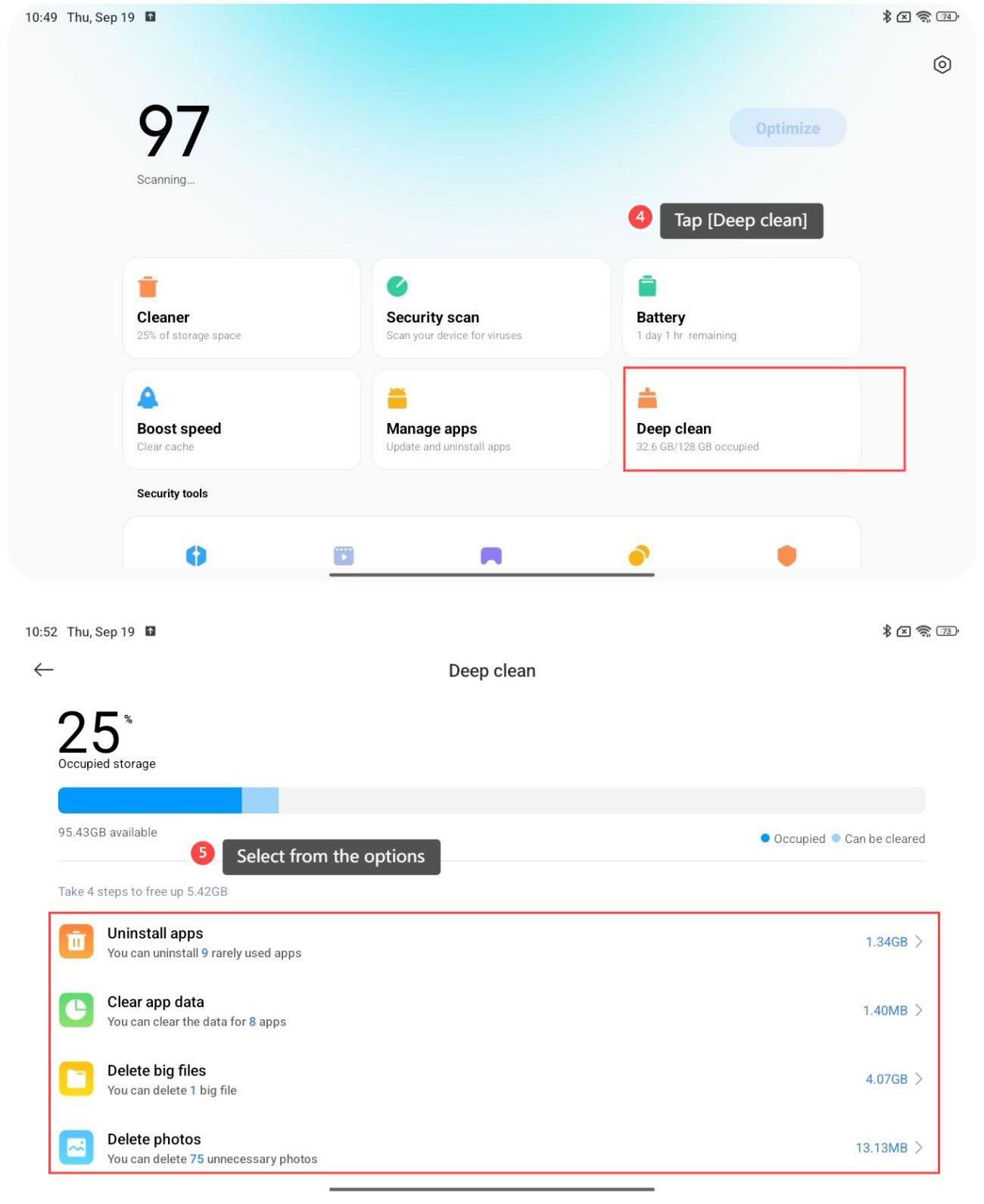 Redmi Pad SE 8.7 4G hỗ trợ giải phóng dung lượng lưu trữ, có thể lưu các tài liệu, ảnh và APP cần thiết mà không phải lo lắng về việc hết dung lượng và có đủ dung lượng lưu trữ để giúp tạo bản sao lưu các tệp và APP của bạn dễ dàng hơn, bảo vệ chống mất dữ liệu. Để giải phóng dung lượng lưu trữ của máy tính bảng, vui lòng tham khảo các phương pháp sau: Cách 1: 1. Đi tới [Cài đặt]; 2. Nhấn vào [Giới thiệu về máy tính bảng]; 3. Nhấn vào [Bộ nhớ]; 4. Nhấn vào [Giải phóng]. Cách 2: 1. Đi tới [Bảo mật]; 2. Nhấn vào [Trình dọn dẹp]; 3. Nhấn vào [Dọn dẹp]; 4. Bạn cũng có thể nhấn vào [Làm sạch sâu]; 5. Chọn từ các tùy chọn để làm sạch dữ liệu tương ứng. Ghi: Vui lòng không xóa sai dữ liệu hữu ích khi bạn giải phóng dung lượng lưu trữ khỏi tùy chọn làm sạch sâu.