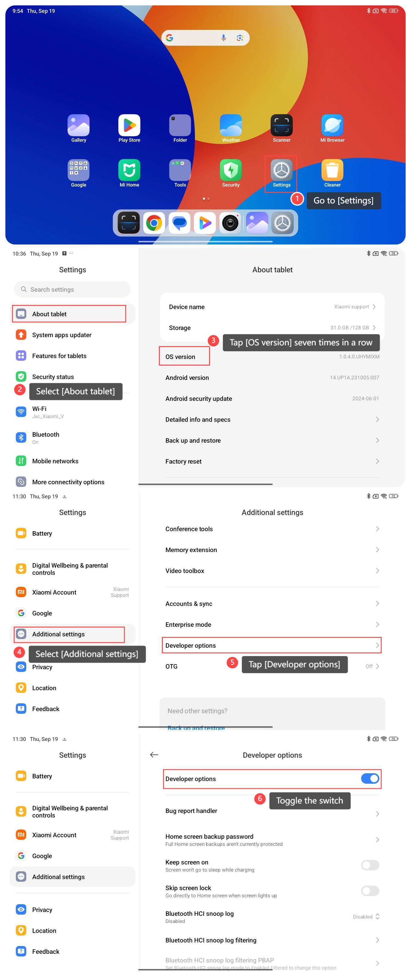 Để bật Tùy chọn nhà phát triển trên máy tính bảng của bạn, vui lòng tham khảo các bước sau: