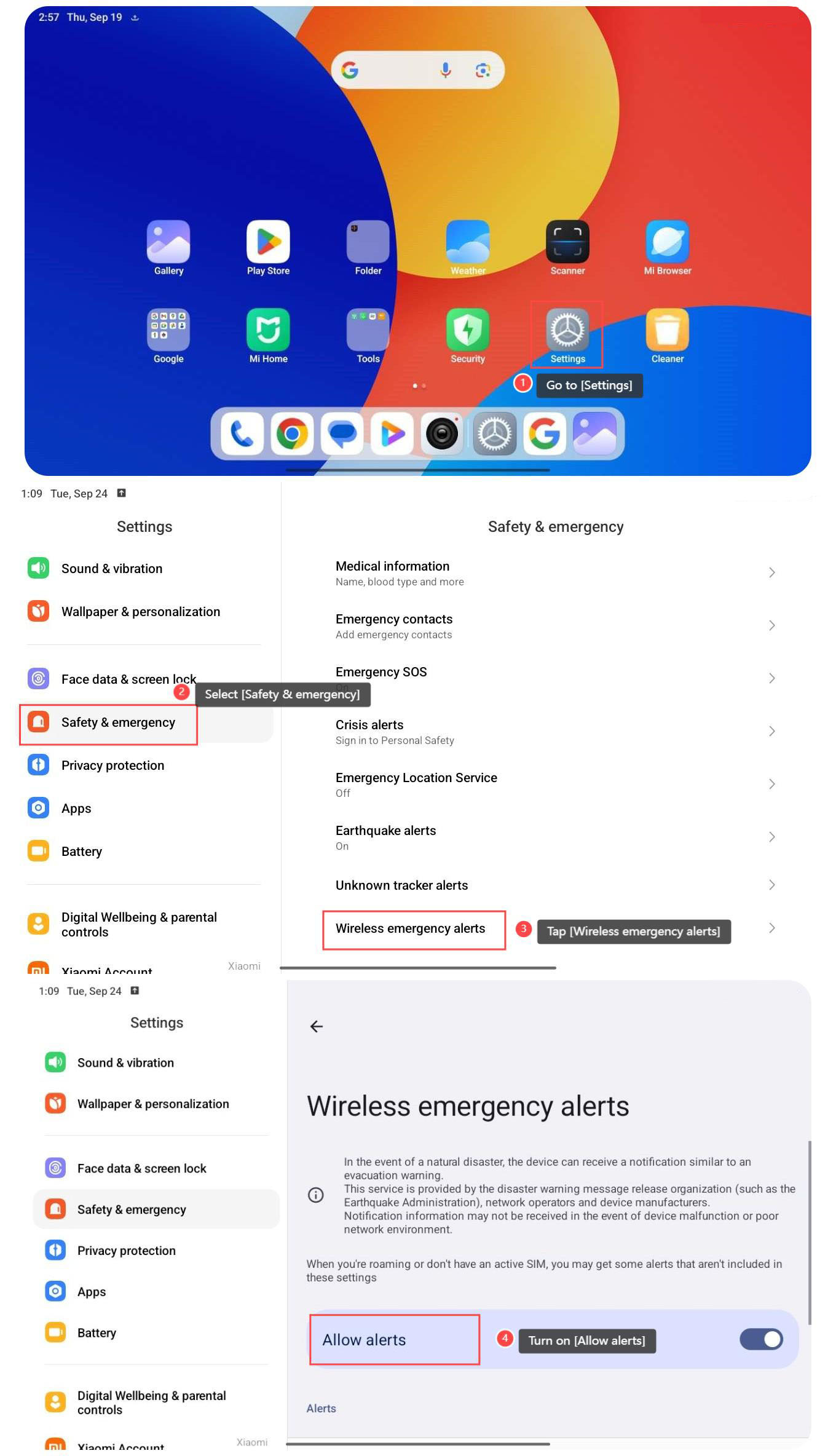 4. Bật [Cho phép cảnh báo] và thiết bị của bạn sẽ bật cảnh báo khẩn cấp không dây. Bạn có thể chọn cảnh báo bạn muốn bật và chọn thời gian bạn muốn bật.