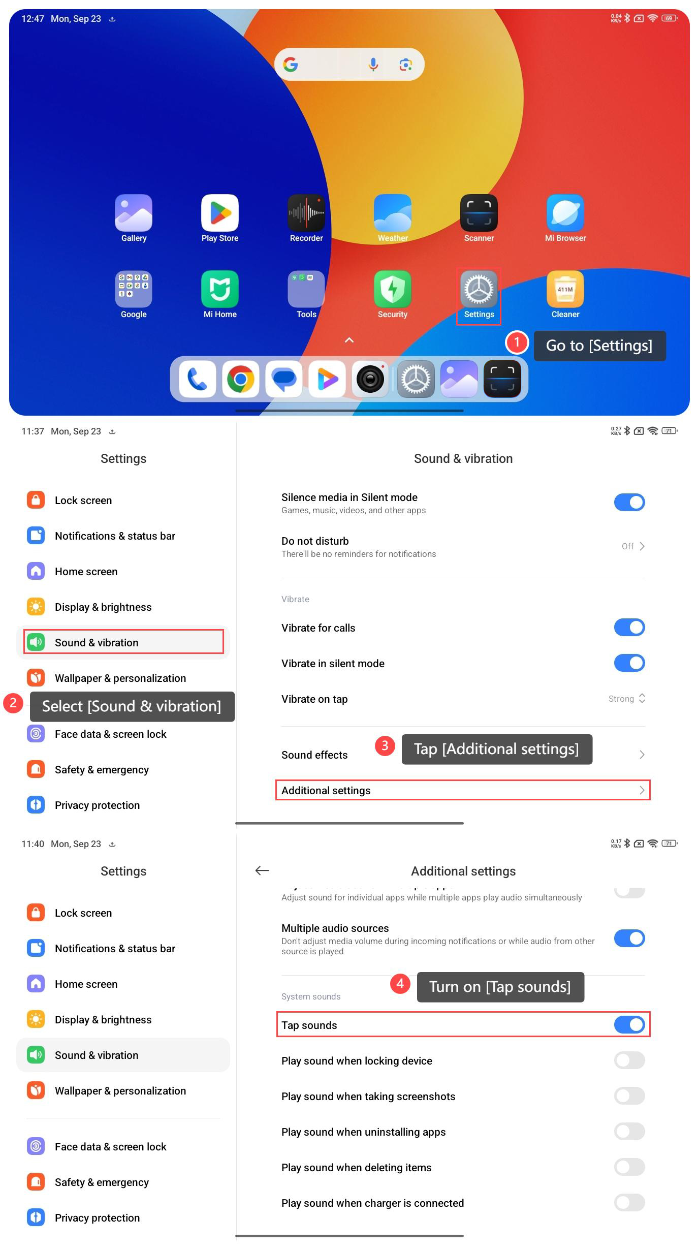 Để bật/tắt Nhấn vào âm thanh trên máy tính bảng của bạn, vui lòng tham khảo các bước sau: