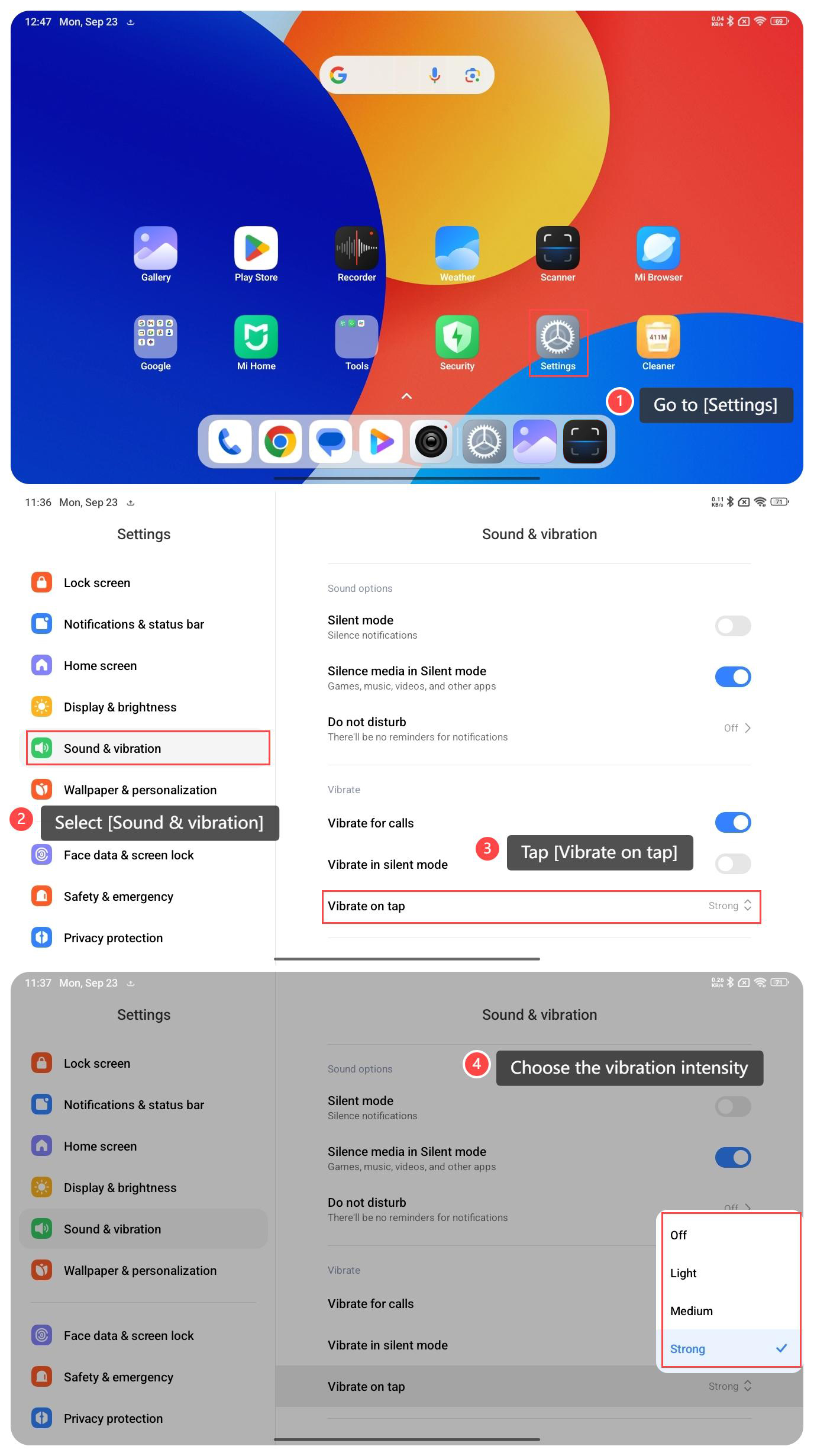 Để đặt khẩu phần rung khi chạm vào máy tính bảng của bạn, vui lòng tham khảo các bước sau: