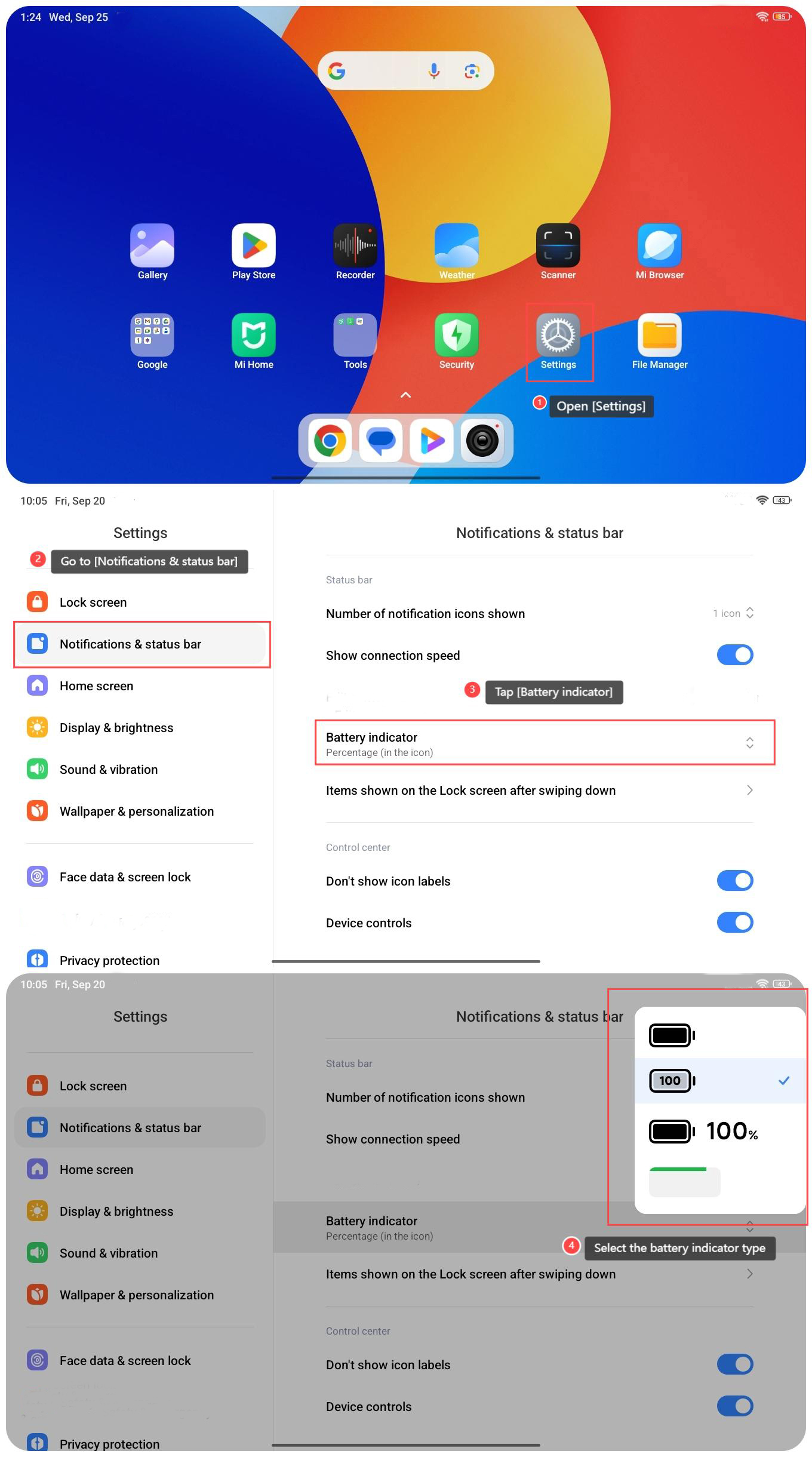 Để điều chỉnh loại chỉ báo pin trên Redmi Pad SE 8.7, vui lòng tham khảo các bước sau: