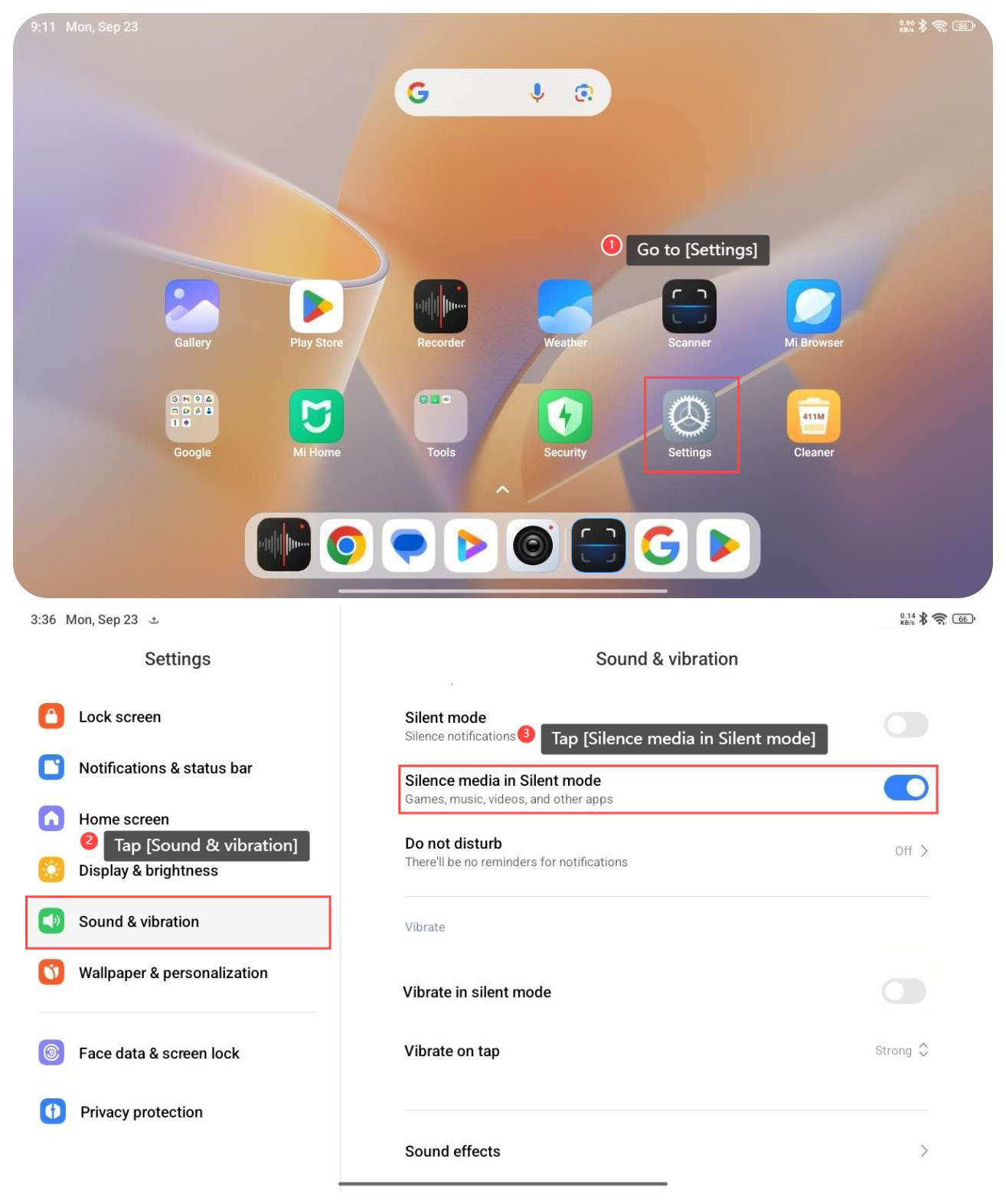 Để tắt tiếng phương tiện ở chế độ Im lặng trên máy tính bảng của bạn, vui lòng tham khảo các bước sau: