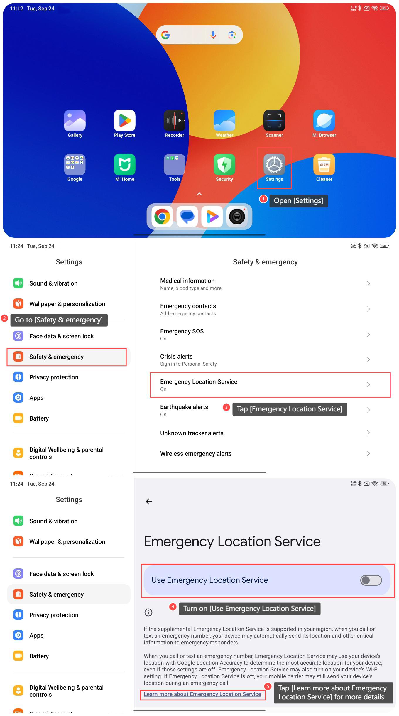 Để bật Dịch vụ vị trí khẩn cấp trên Redmi Pad SE 8.7 4G, vui lòng tham khảo các bước sau: