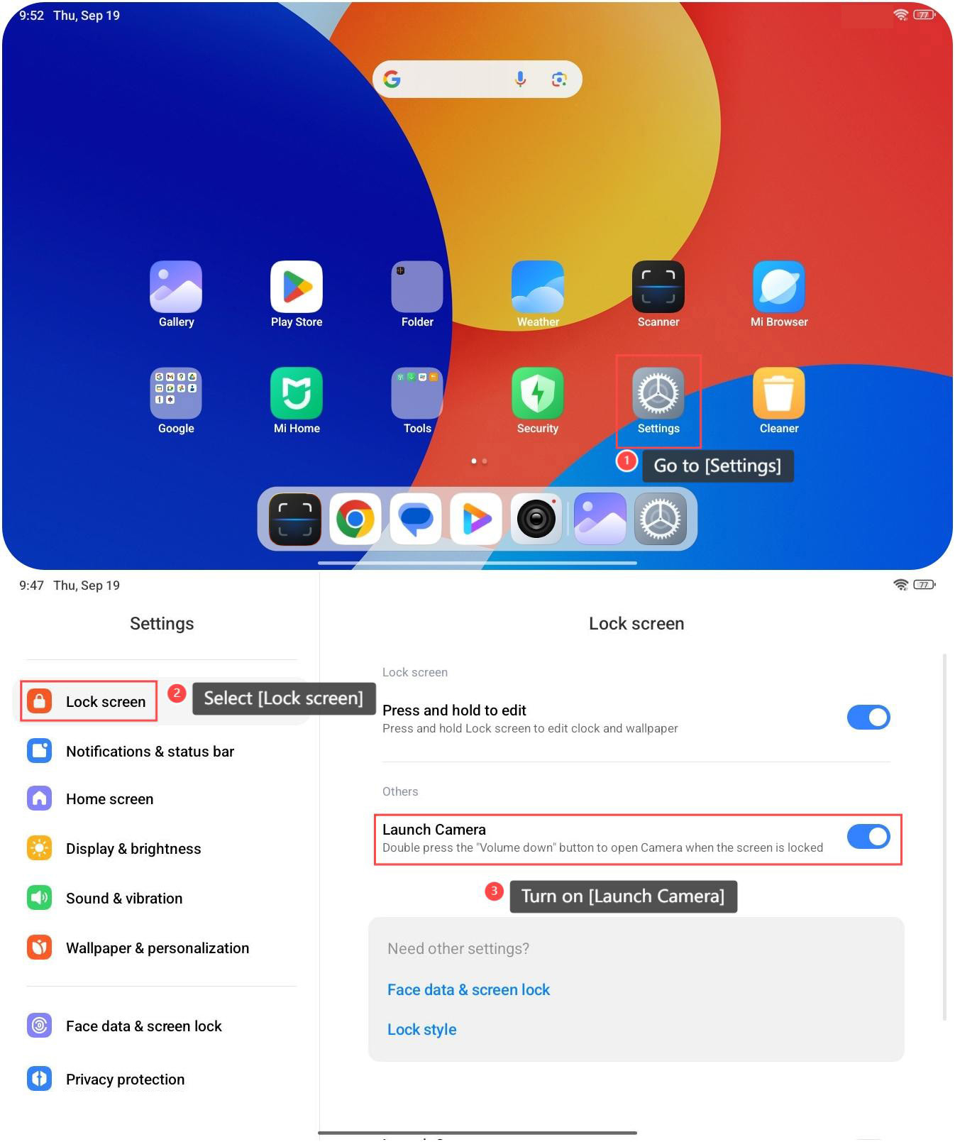 3. Bật [Khởi chạy máy ảnh]. Sau đó, bạn có thể nhấn nút "Giảm âm lượng" hai lần để mở Camera khi màn hình bị khóa.
