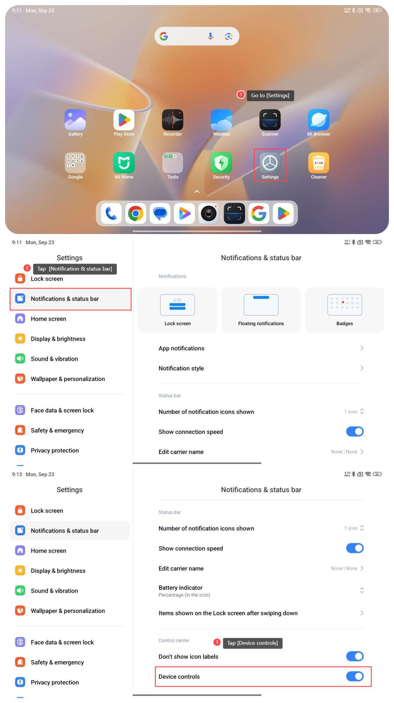 Để định cấu hình bật hoặc tắt Mi Home / Xiaomi Home APP trên trung tâm điều khiển của máy tính bảng của bạn, vui lòng tham khảo các bước sau: