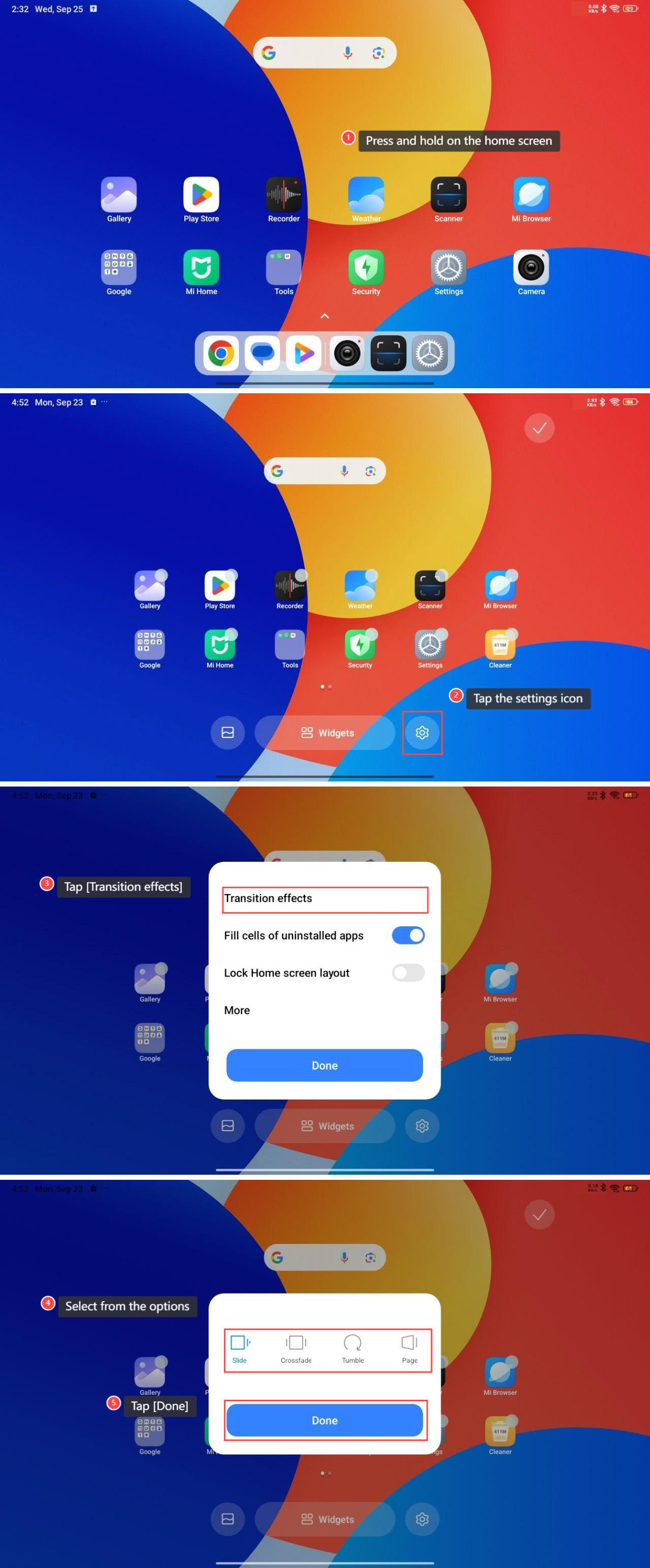 Các hiệu ứng chuyển tiếp trên Redmi Pad SE 8.7 cung cấp một số lợi thế, giúp nâng cao tính thẩm mỹ tổng thể của giao diện sử dụng, giúp điều hướng cảm thấy mượt mà và hấp dẫn hơn. Chúng có thể hoạt động như phản hồi trực quan khi mở hoặc đóng APP, cho biết rằng một hành động đã được hoàn thành thành công. Bằng cách làm mềm sự thay đổi từ màn hình này sang màn hình khác, các hiệu ứng chuyển tiếp có thể ngăn giao diện cảm thấy chói tai hoặc rời rạc.