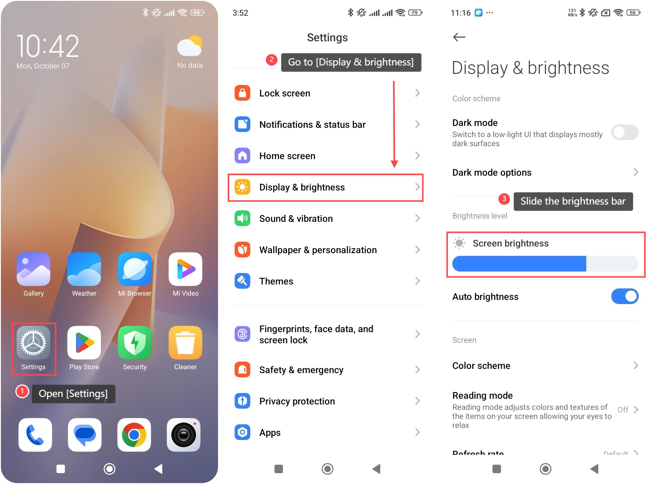 Độ sáng màn hình trên Redmi 13C 5G đề cập đến cường độ ánh sáng của màn hình, có thể được điều chỉnh cho phù hợp với các điều kiện ánh sáng khác nhau. Bạn có thể tăng độ sáng để có tầm nhìn tốt hơn trong môi trường sáng hoặc giảm độ sáng để giảm mỏi mắt trong môi trường tối hơn.