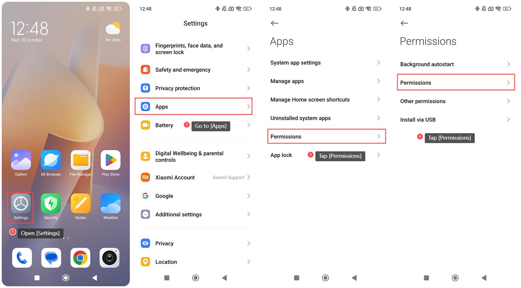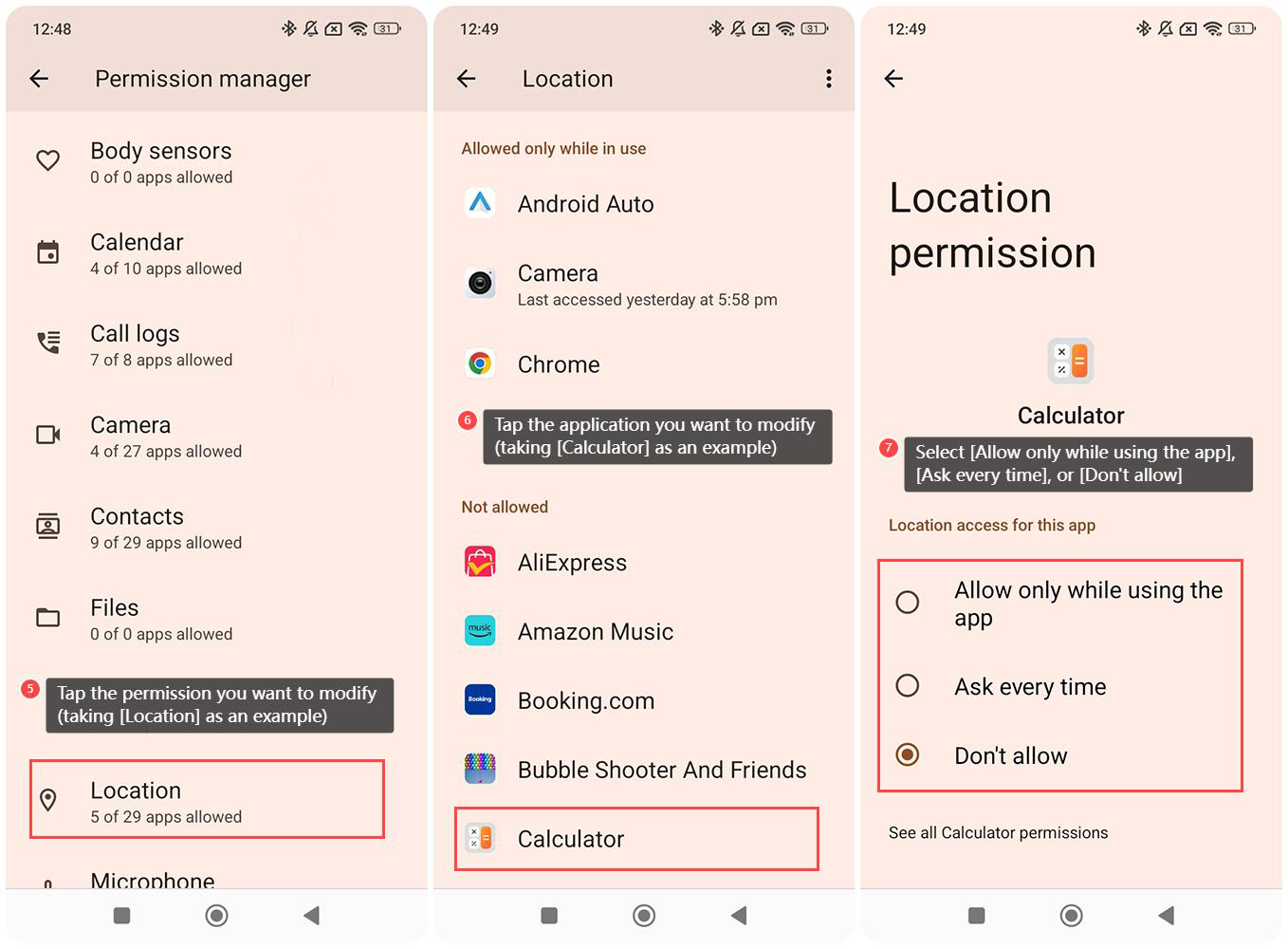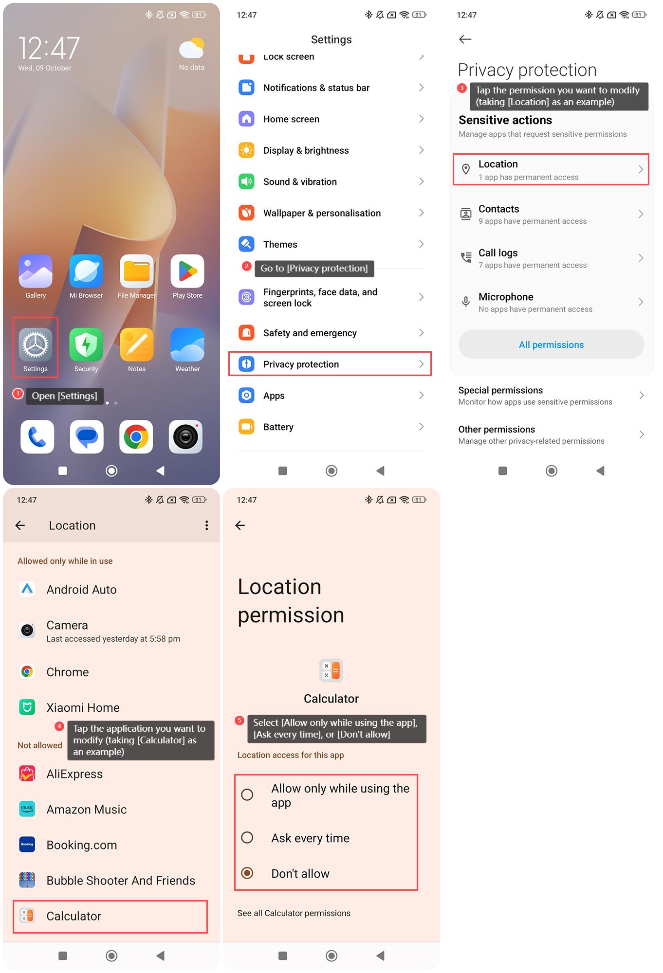 Quản lý quyền ứng dụng trên Redmi 13C cho phép bạn kiểm soát dữ liệu và tính năng mà mỗi ứng dụng có thể truy cập. Điều này bao gồm các quyền cho máy ảnh, micrô, vị trí, bộ nhớ và danh bạ, trong số những quyền khác. Bằng cách xem xét và điều chỉnh các quyền này trong cài đặt, bạn có thể tăng cường quyền riêng tư và bảo mật của mình bằng cách đảm bảo rằng các ứng dụng chỉ truy cập thông tin cần thiết cho chức năng của chúng. Để quản lý quyền cho các ứng dụng trên Redmi 13C, vui lòng tham khảo các phương pháp sau: Cách 1: 1. Mở [Cài đặt]; 2. Đi tới [Bảo vệ quyền riêng tư]; 3. Nhấn vào quyền bạn muốn sửa đổi (lấy [Vị trí] làm ví dụ); 4. Nhấn vào ứng dụng bạn muốn sửa đổi (lấy [Máy tính] làm ví dụ); 5. Chọn [Chỉ cho phép khi sử dụng ứng dụng], [Hỏi mọi lúc] hoặc [Không cho phép]. Cách 2: 1. Mở [Cài đặt]; 2. Đi tới [Ứng dụng]; 3. Nhấn vào [Quyền]; 4. Nhấn vào [Quyền]; 5. Nhấn vào quyền bạn muốn sửa đổi (lấy [Vị trí] làm ví dụ); 6. Nhấn vào ứng dụng bạn muốn sửa đổi (lấy [Máy tính] làm ví dụ); 7. Chọn [Chỉ cho phép khi sử dụng ứng dụng], [Hỏi mọi lúc] hoặc [Không cho phép].