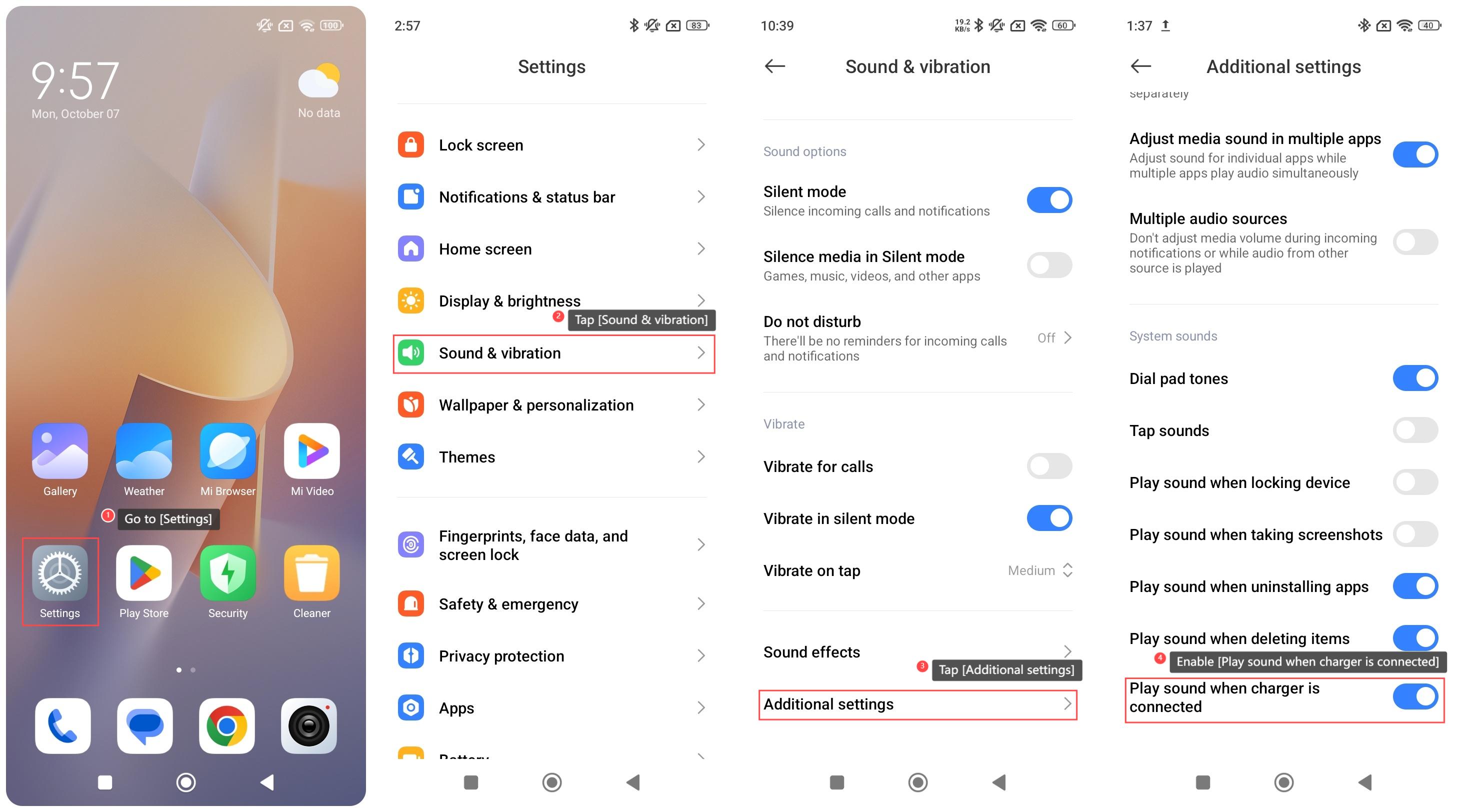 Để thực hiện Điện thoại của bạn phát âm thanh khi bộ sạc được kết nối, vui lòng tham khảo các bước sau: