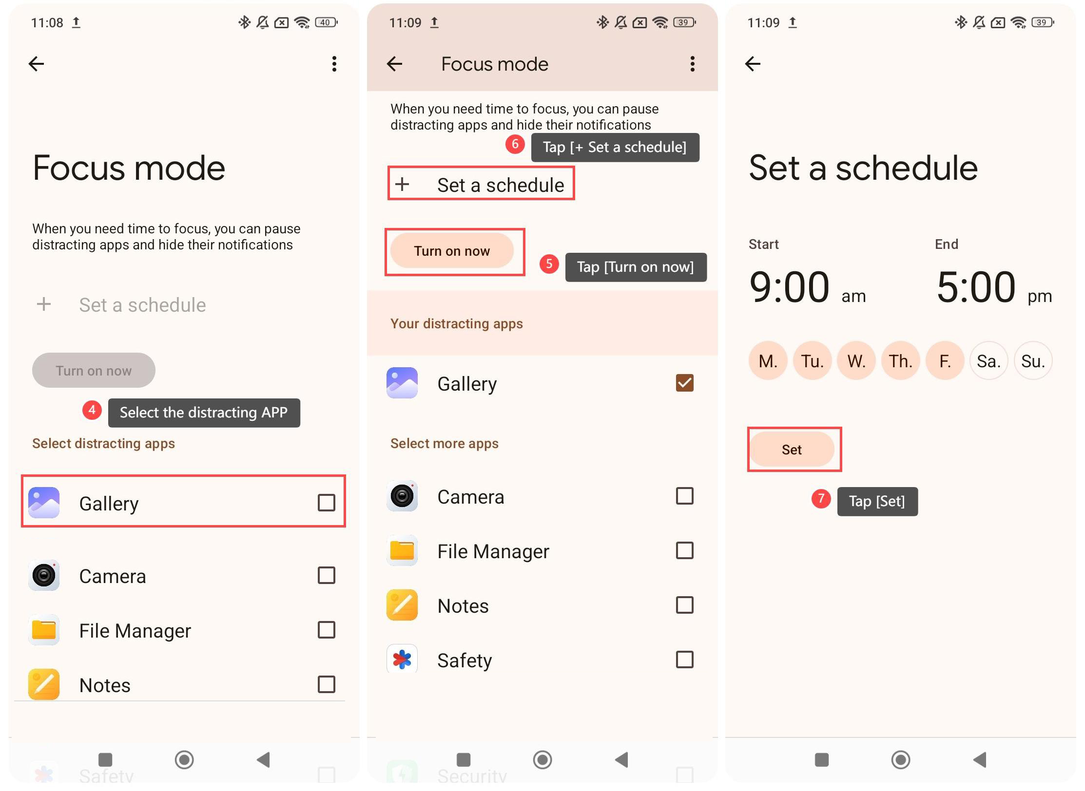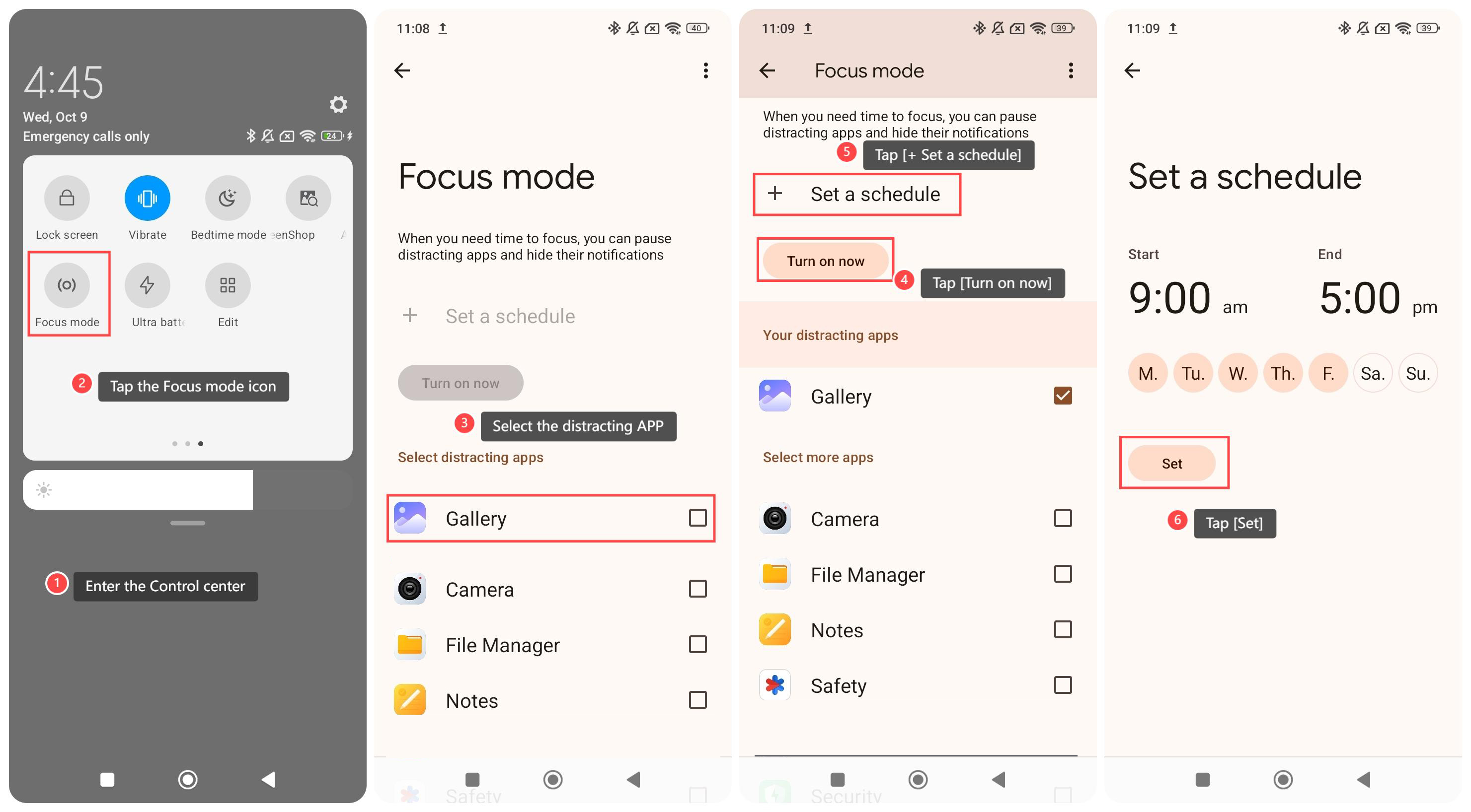 Redmi 13C hỗ trợ chế độ Lấy nét. Nó có thể giảm thiểu phiền nhiễu bằng cách chặn các APP và thông báo không cần thiết, giúp cải thiện sự tập trung và năng suất. Để thiết lập chế độ Lấy nét trên điện thoại, vui lòng tham khảo các phương pháp sau: Cách 1: 1. Đi tới ỨNG DỤNG [Cài đặt] trên điện thoại của bạn; 2. Cuộn xuống và nhấn vào [Digital Wellbeing &; parental controls]; 3. Schọntùy chọn [Focus mode(Chế độ lấy nét)]; 4. Schọn APP gây mất tập trung mà bạn muốn tạm dừng và ẩn thông báo; 5. Bạn có thể nhấn vào [Bật ngay] để bật tính năng này ngay bây giờ; 6. Nếu bạn muốn thiết lập lịch trình tùy chỉnh cho thời gian lấy nét, vui lòng nhấn [+ Đặt lịch biểu]; 7. Set up tần suất và thời điểmđiện thoại tự động khởi động và kết thúc chế độ Lấy nét và sau đó nhấn [Đặt]. Cách 2: 1. Cuộn xuống từ đầu màn hình để vào Trung tâm điều khiển; 2. Tìm và nhấn vào biểu tượng Chế độ lấy nét; 3. Schọn APP gây mất tập trung mà bạn muốn tạm dừng và ẩn thông báo; 4. Bạn có thể nhấn vào [Bật ngay] để bật tính năng này ngay bây giờ; 5. Nếu bạn muốn thiết lập lịch trình tùy chỉnh cho thời gian lấy nét, vui lòng nhấn [+ Đặt lịch biểu]; 6. Set lên tần suất và thời điểm điện thoại tự động khởi động và kết thúc chế độ Lấy nét và sau đó nhấn [Đặt].