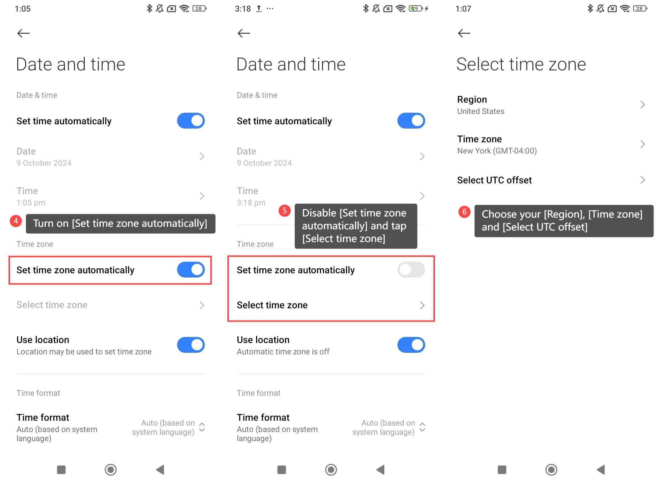 4. Bật [Đặt múi giờ tự động] và điện thoại của bạn có thể tự động phát hiện và điều chỉnh múi giờ dựa trên vị trí hiện tại của bạn;
