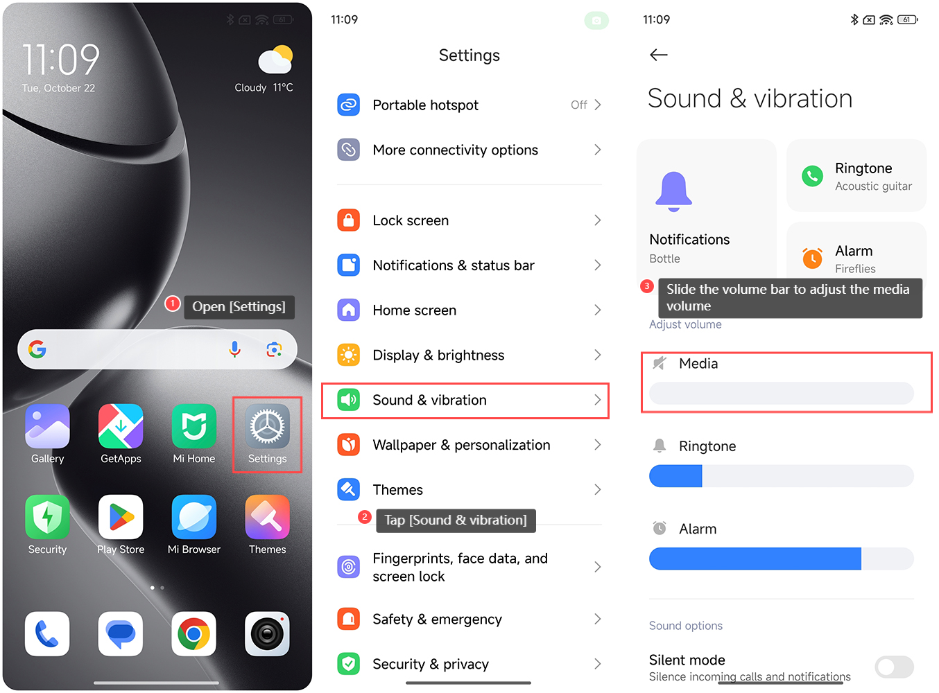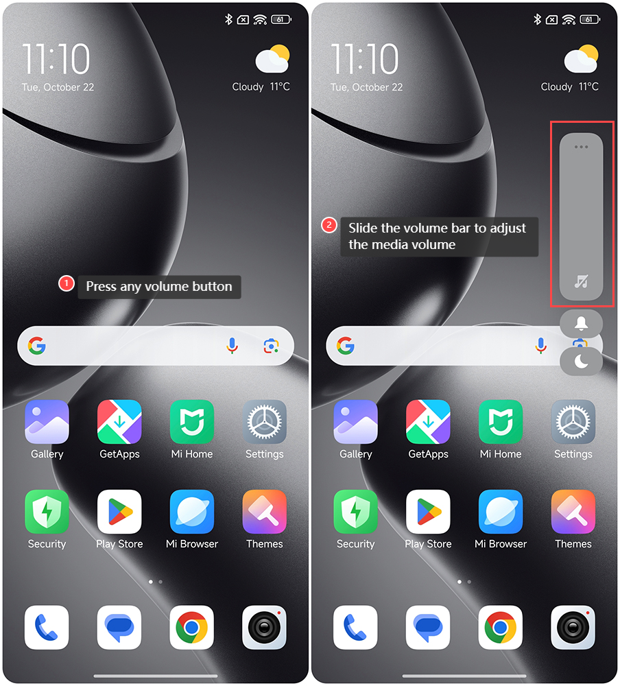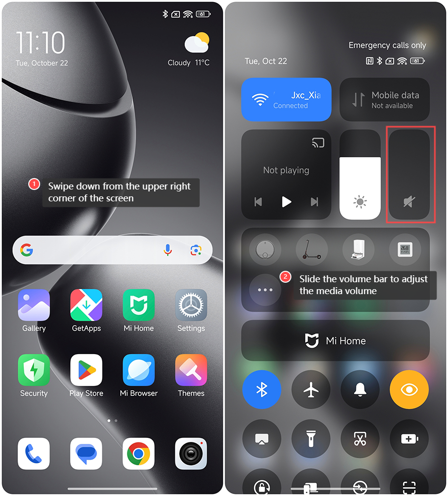 Điều chỉnh âm lượng phương tiện trên Xiaomi 14T Pro cung cấp một số chức năng. Bạn có thể quản lý mức âm thanh của nhạc, video và trò chơi theo môi trường xung quanh, đảm bảo trải nghiệm nghe tối ưu. Bạn cũng có thể tùy chỉnh mức âm lượng cho phù hợp với sở thích cá nhân cho các loại phương tiện khác nhau. Giảm âm lượng phương tiện có thể giúp ngăn chặn việc làm phiền người khác trong không gian chung, nâng cao nghi thức xã hội. Để điều chỉnh âm lượng phương tiện trên Xiaomi 14T Pro, vui lòng tham khảo các phương pháp sau: Cách 1: 1. Mở [Cài đặt] trên điện thoại của bạn; 2. Nhấn vào [Âm thanh và rung]; 3. Trượt thanh âm lượng để điều chỉnh âm lượng phương tiện. Cách 2: 1. Nhấn bất kỳ nút âm lượng nào; 2. Trượt thanh âm lượng để điều chỉnh âm lượng phương tiện. Cách 3: 1. Vuốt xuống từ góc trên bên phải của màn hình để vào trung tâm điều khiển; 2. Trượt thanh âm lượng để điều chỉnh âm lượng phương tiện.