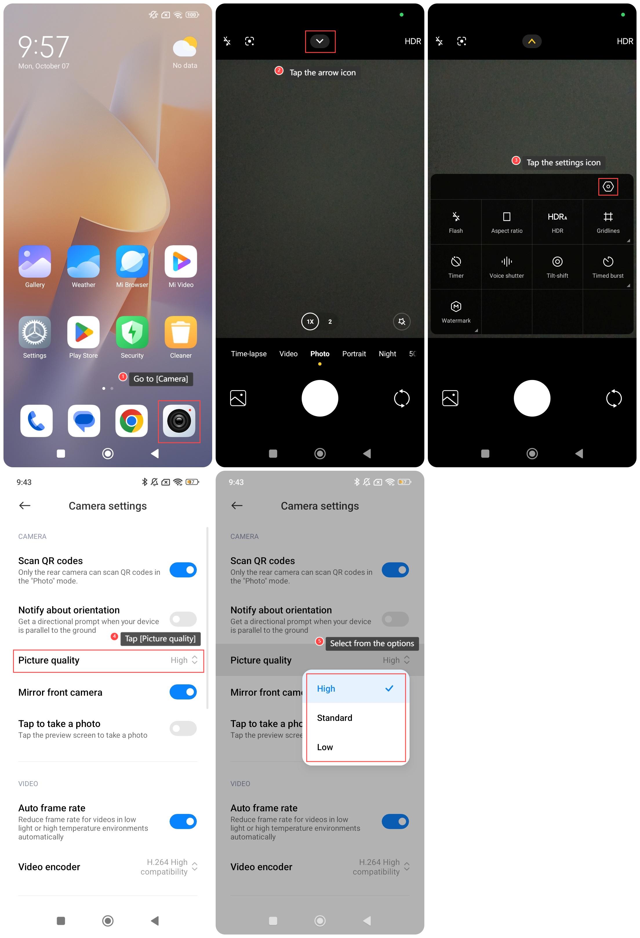 Redmi 13C 5G hỗ trợ thiết lập chất lượng hình ảnh, cho phép bạn kiểm soát các khía cạnh khác nhau về cách chụp và lưu trữ ảnh, ảnh hưởng đến kích thước, chi tiết và giao diện tệp. Đặt chất lượng hình ảnh xác định số lượng pixel trong ảnh. Độ phân giải cao hơn cung cấp nhiều chi tiết hơn nhưng tạo kích thước tệp lớn hơn. Độ phân giải thấp hơn rất hữu ích để tiết kiệm dung lượng lưu trữ hoặc chia sẻ trực tuyến một cách nhanh chóng.