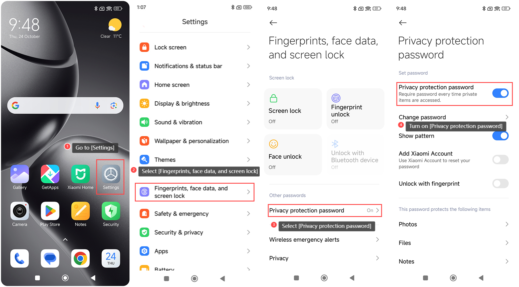 Ghi chú riêng tư trên Xiaomi 14T là một tính năng an toàn để tạo và lưu trữ các ghi chú mà chỉ bạn mới có thể truy cập. Những lưu ý này có thể được bảo vệ bằng mật khẩu bảo vệ quyền riêng tư, giúp giữ an toàn cho thông tin nhạy cảm. Bạn có thể sử dụng tính năng này cho lời nhắc cá nhân, thông tin nhạy cảm hoặc bất cứ điều gì bạn muốn giữ bí mật. Để thực hiện các ghi chú riêng tư trên Xiaomi 14T, vui lòng tham khảo các bước sau: 1. Đi tới ỨNG DỤNG [Cài đặt] trên điện thoại của bạn; 2. Nhấn vào [Vân tay, dữ liệu khuôn mặt và khóa màn hình]; 3. Chọn [Mật khẩu bảo vệ quyền riêng tư]; 4. Bật [Mật khẩu bảo vệ quyền riêng tư] và bạn có thể làm theo lời nhắc để đặt hình mở khóa; 5. Sau khi thiết lập hình mở khóa, hãy nhấn vào [Ghi chú] để mã hóa ghi chú riêng tư; 6. Nhấn vào [Sử dụng] để xác nhận. Điện thoại của bạn sẽ tự động vào APP Ghi chú; 7. Điều hướng đến ghi chú bạn muốn ẩn và chọn ghi chú bằng cách nhấn và giữ nó; 8. Nhấn vào [Ẩn] ở góc dưới cùng bên phải của màn hình. Để kiểm tra các ghi chú riêng tư trên điện thoại của bạn, vui lòng tham khảo các bước sau: 1. Đi tới [Ghi chú]; 2. Kéo xuống và thả ra để kiểm tra các ghi chú riêng tư.