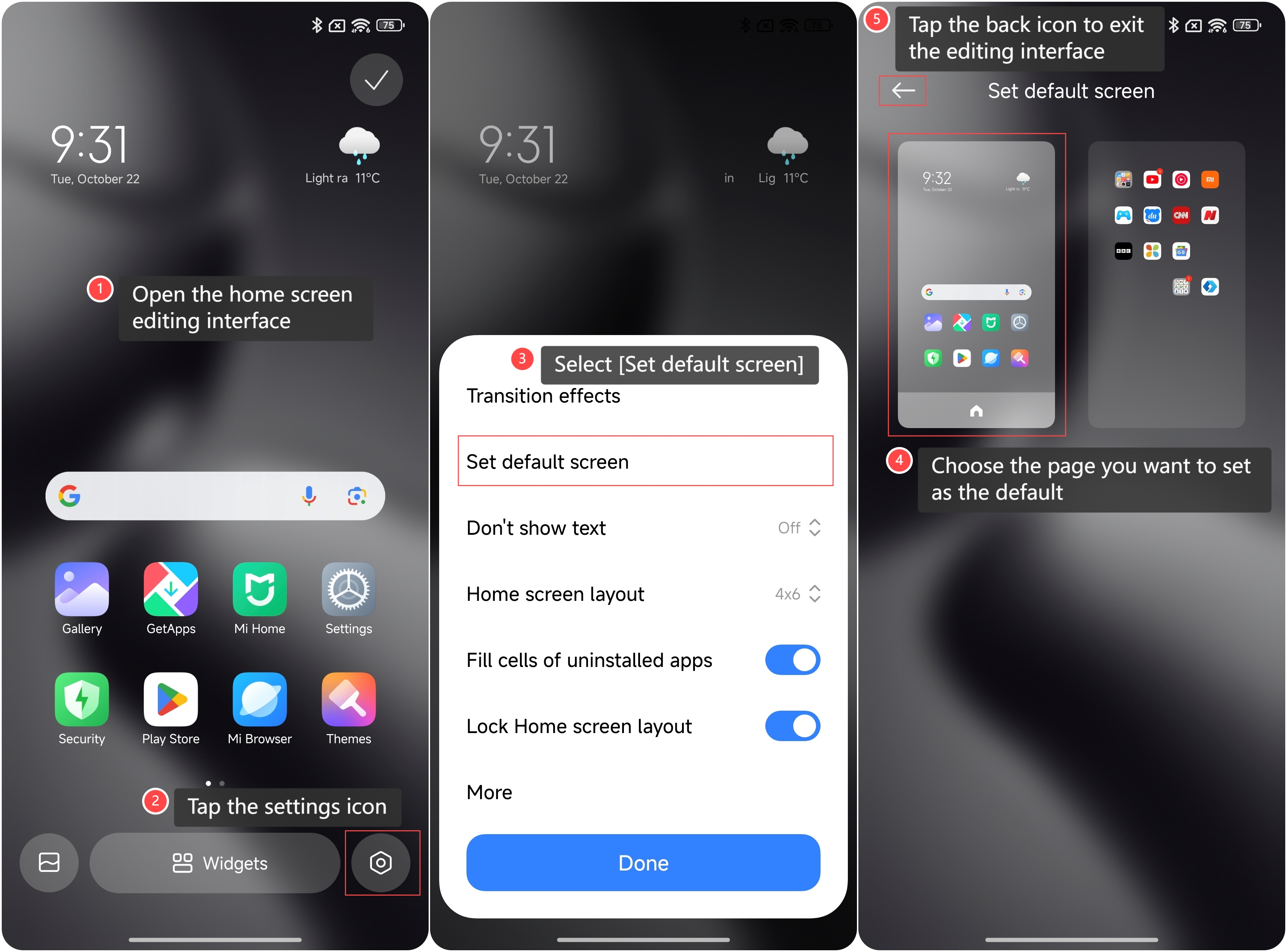 Để đặt màn hình mặc định trên điện thoại của bạn, vui lòng tham khảo các bước sau: