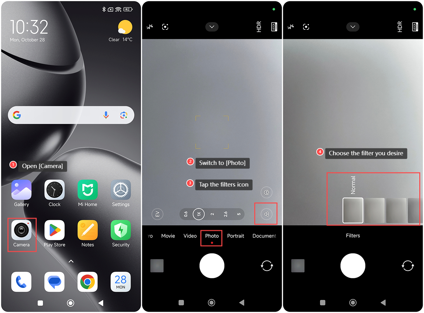 Để điều chỉnh kính lọc trên Xiaomi 14T Pro trong khi chụp ảnh, vui lòng tham khảo các bước sau: