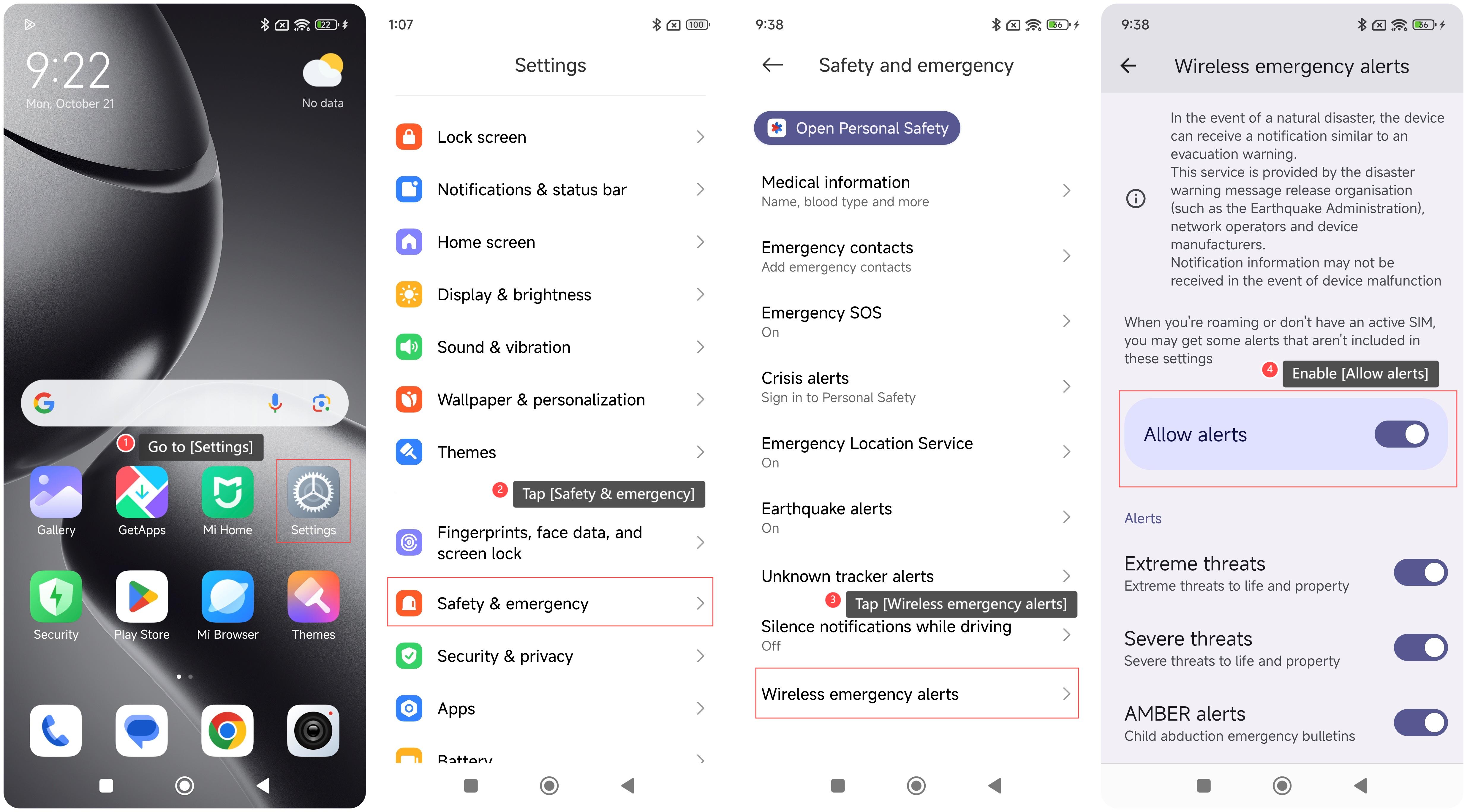 4. Bật [Cho phép cảnh báo] và thiết bị của bạn sẽ bật cảnh báo khẩn cấp không dây. Bạn có thể chọn cảnh báo bạn muốn bật và chọn thời gian bạn muốn bật.
