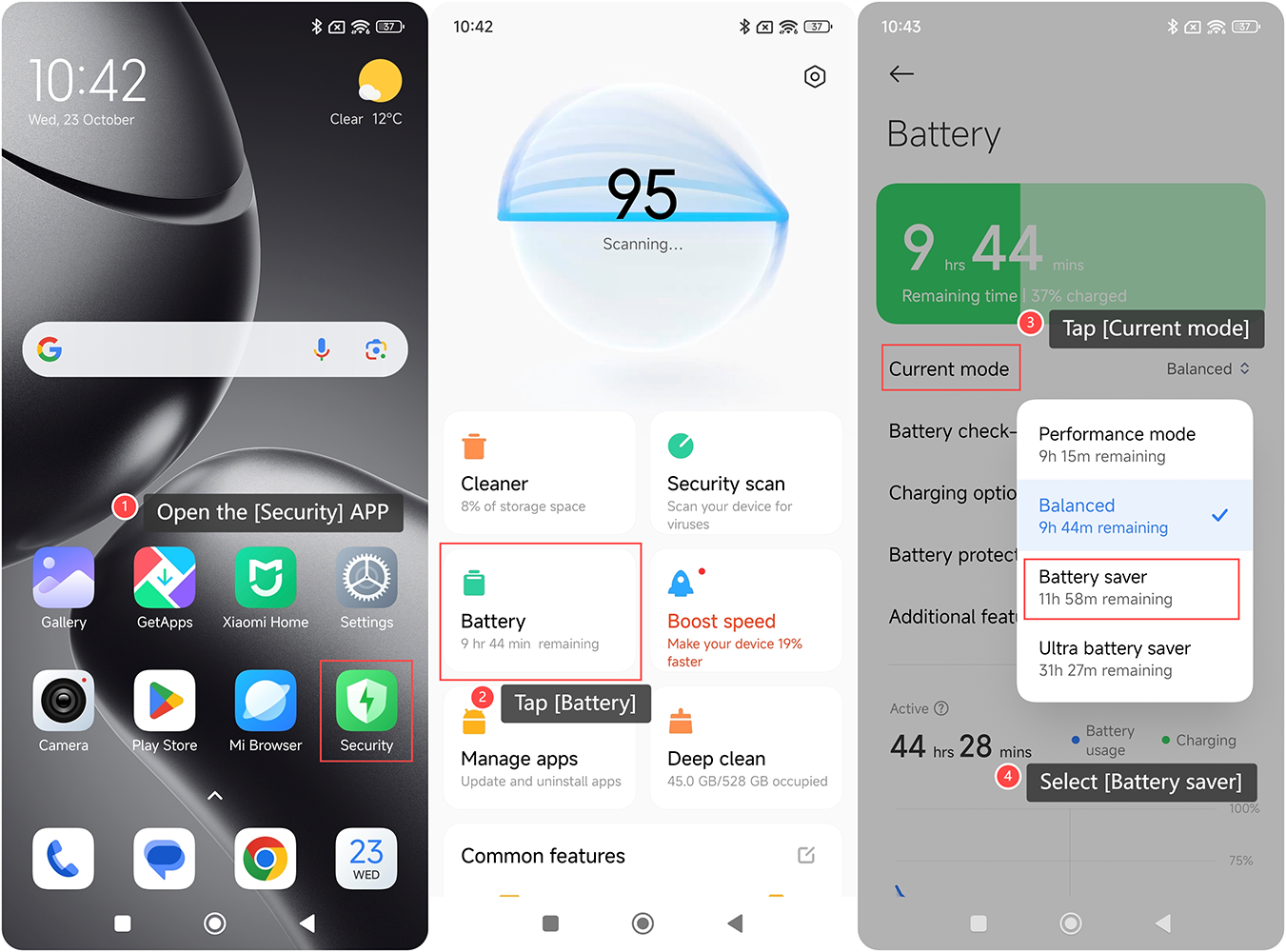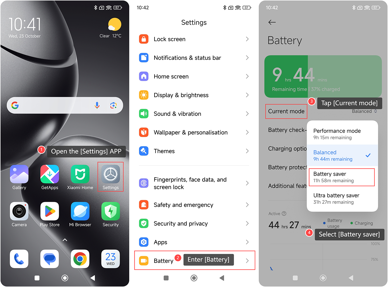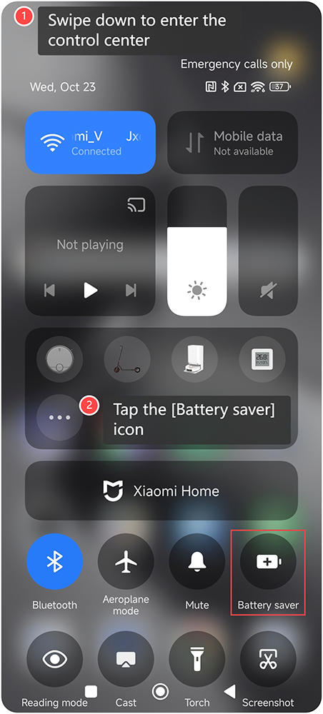 Tính năng Tiết kiệm pin trên Xiaomi 14T được thiết kế để kéo dài tuổi thọ pin bằng cách điều chỉnh cài đặt hệ thống và giảm các hoạt động nền. Khi được bật, nó giúp tiết kiệm năng lượng bằng cách hạn chế một số chức năng và quy trình tiêu thụ pin. Để bật Trình tiết kiệm pin trên điện thoại của bạn, vui lòng tham khảo các phương pháp sau: Cách 1: 1. Vuốt xuống để vào trung tâm điều khiển; 2. Nhấn vào biểu tượng [Trình tiết kiệm pin] để bật nhanh. Cách 2: 1. MởAPP [Cài đặt]trên điện thoại của bạn; 2. Nhập [Pin]; 3.Chạmvào [Chế độ hiện tại]; 4. Chọn [Trình tiết kiệm pin]. Cách 3: 1. Mở APP [Security]trên điện thoại của bạn; 2. Nhấn vào [Pin]; 3.Chạmvào [Chế độ hiện tại]; 4. Chọn [Trình tiết kiệm pin].